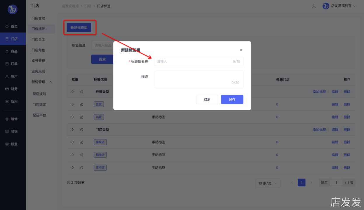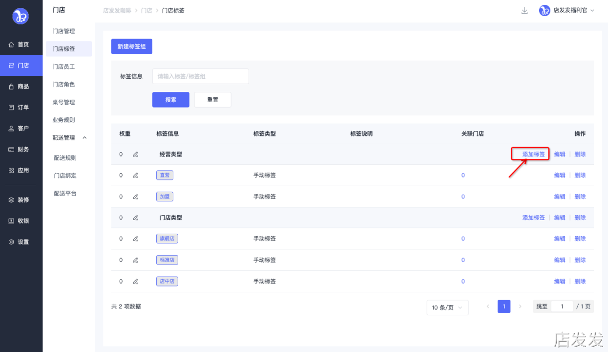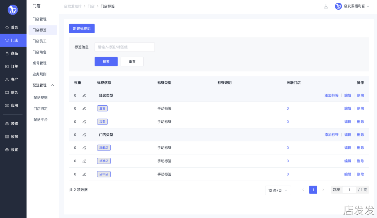 门店管理:店发发品牌后台 - 门店 - 门店标签