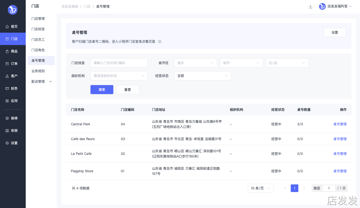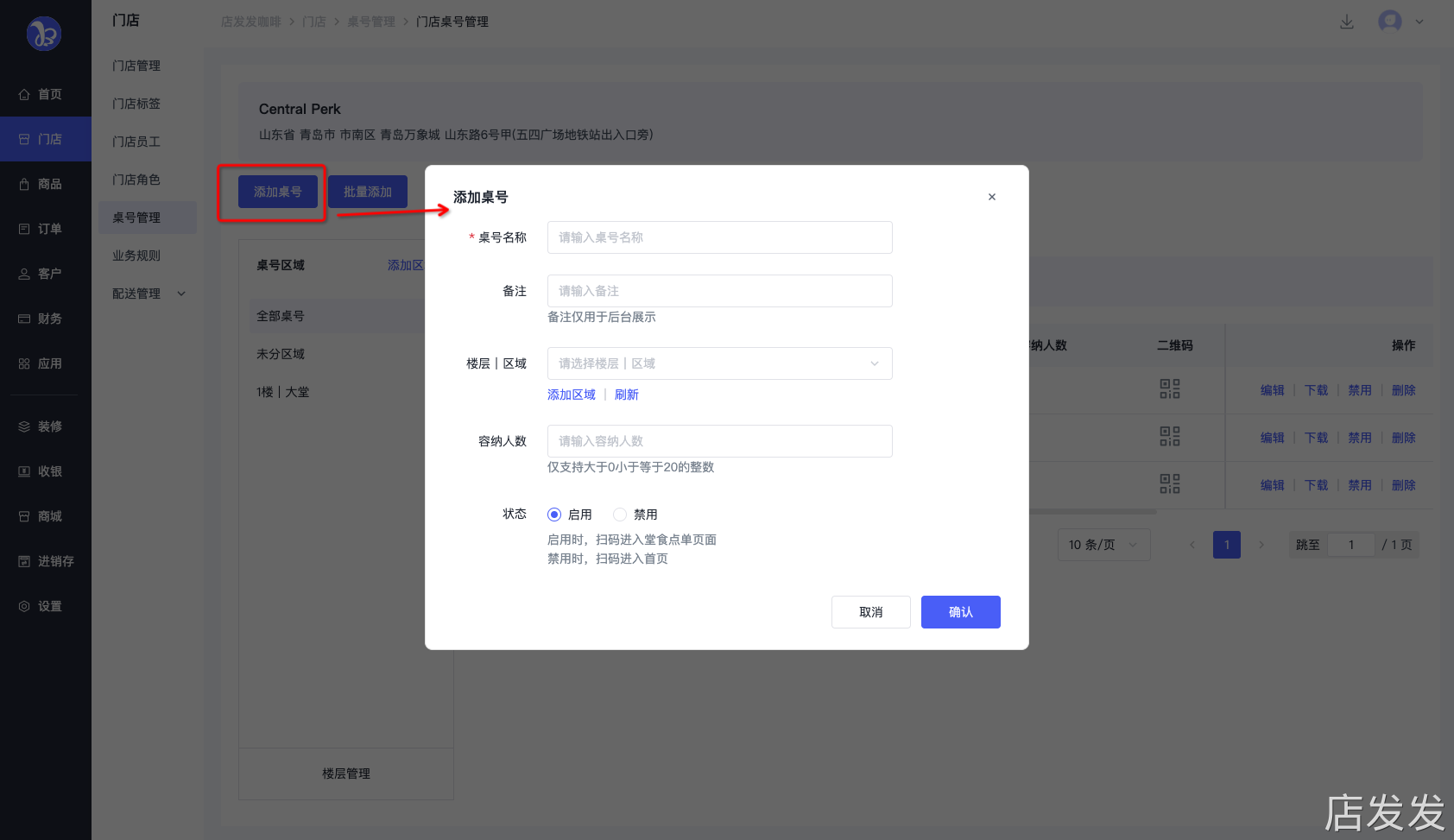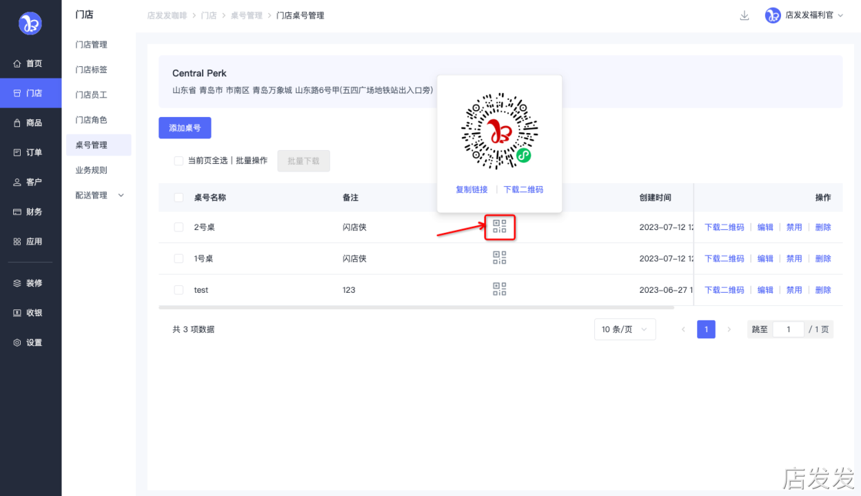 三、功能路径桌号管理:店发发品牌后台 - 门店 - 桌号管理