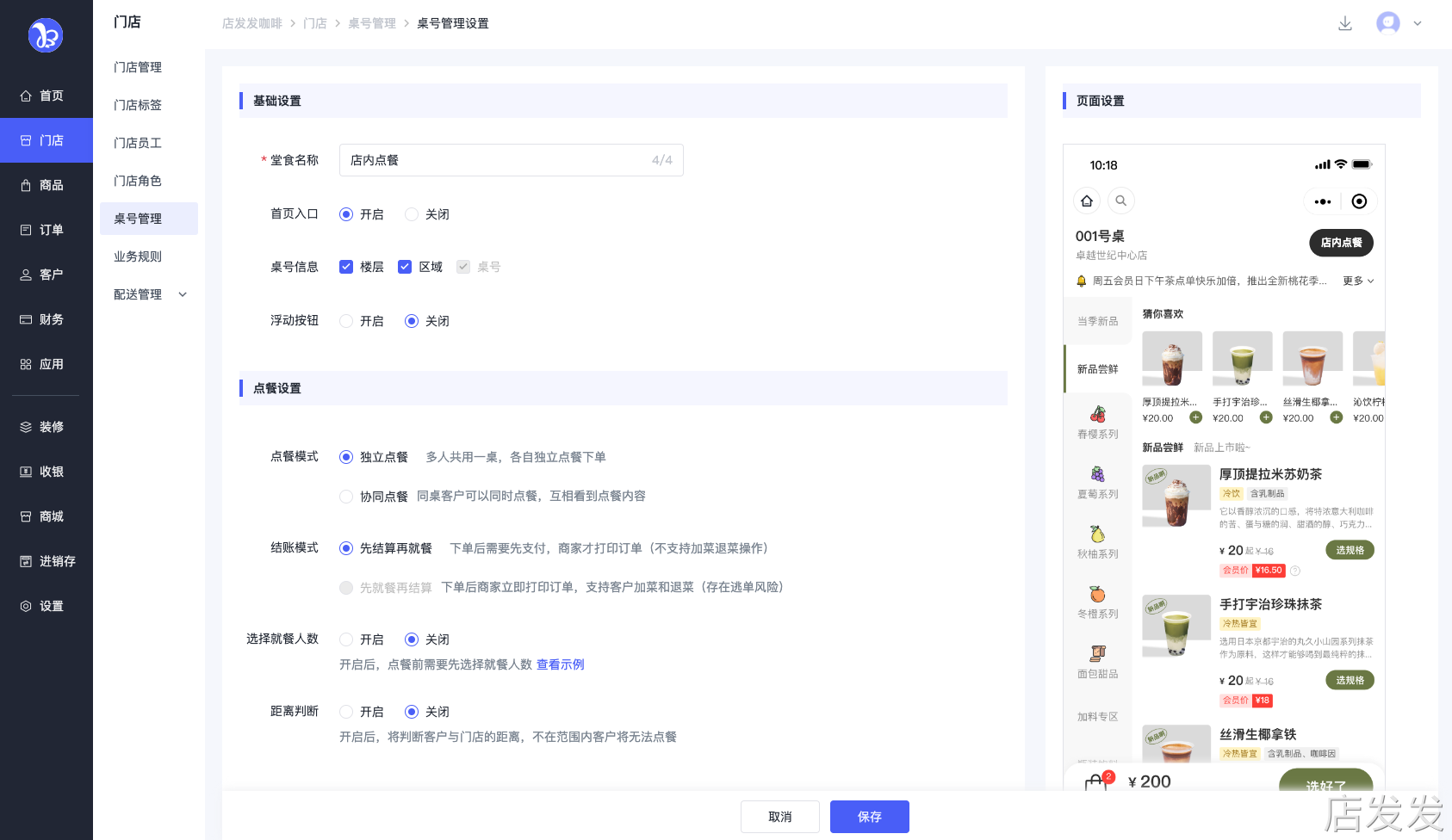 2. 可设置点单模式等基础配置项