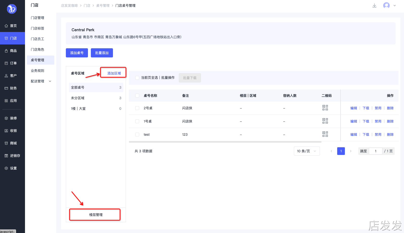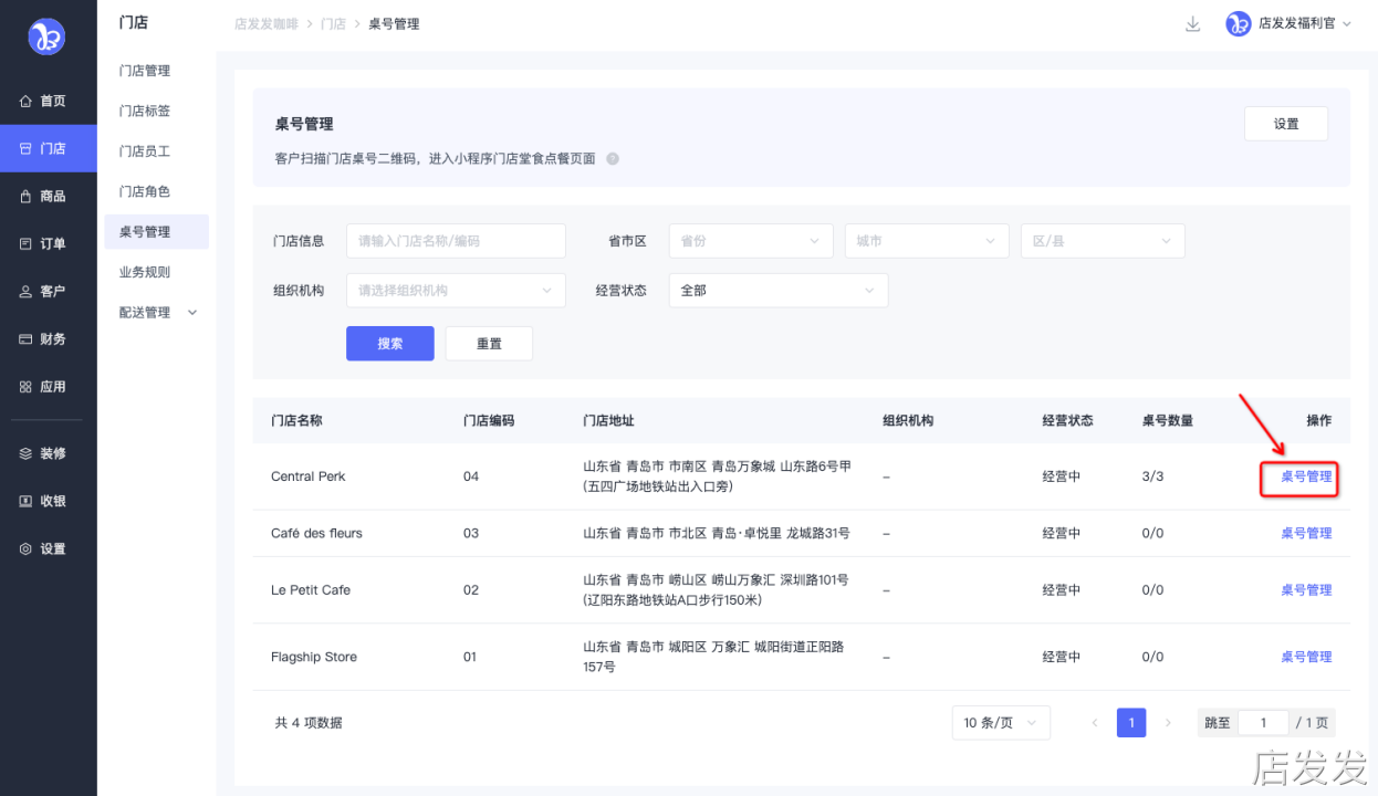 2. 在相关门店桌号管理页面中管理桌号