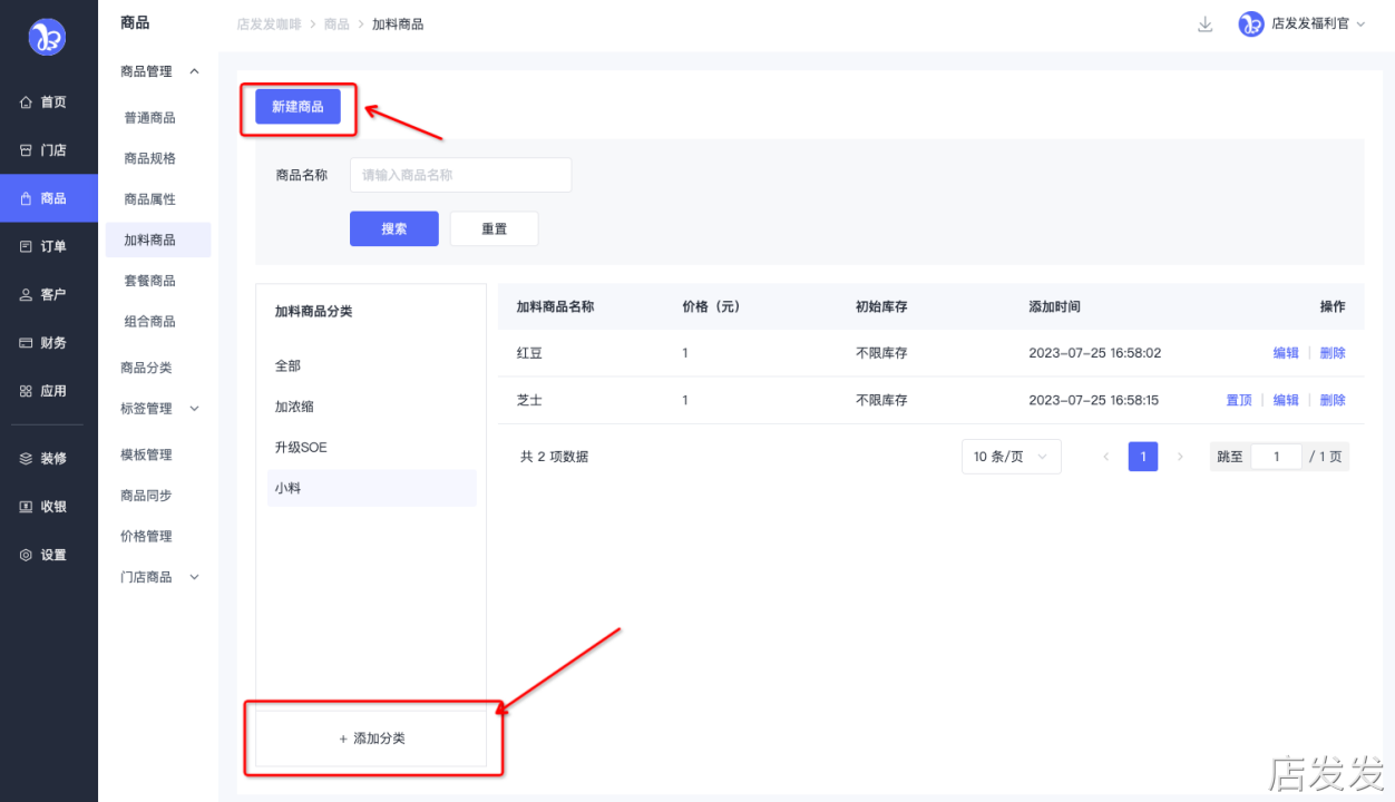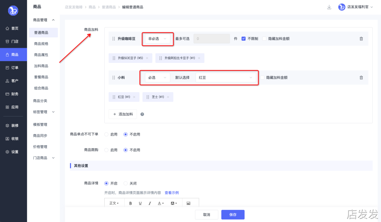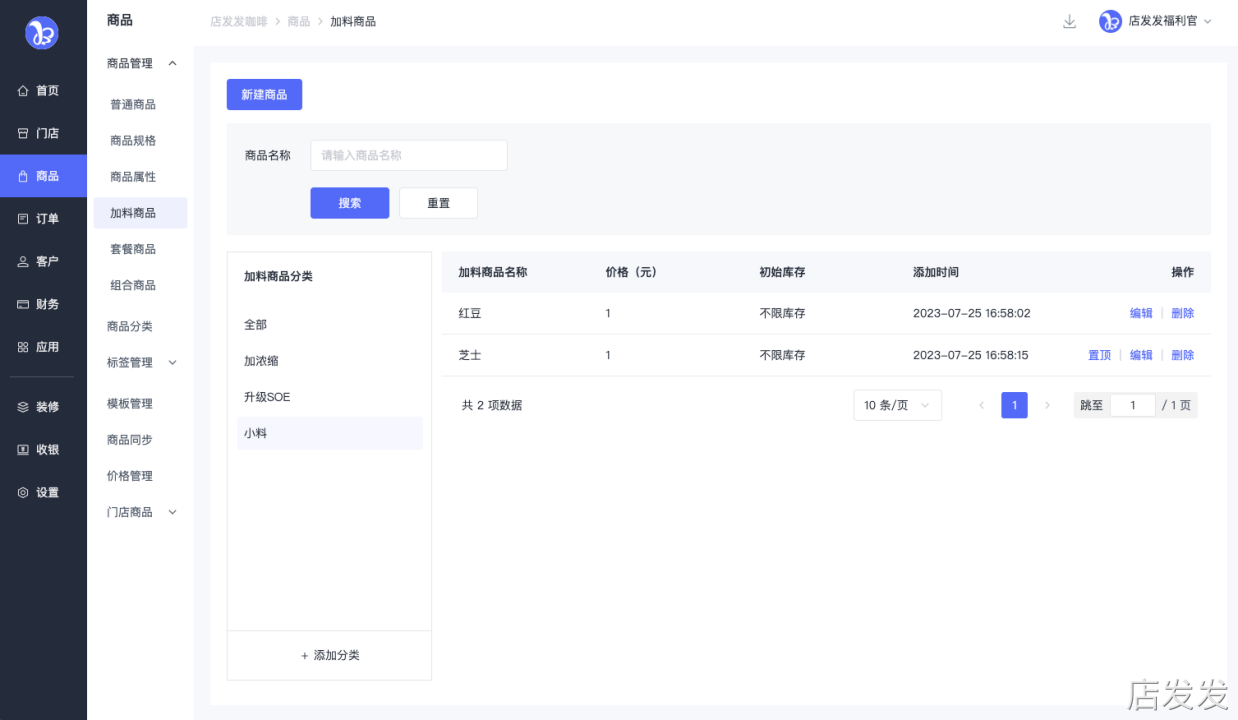 加料商品:店发发品牌后台- 商品 - 商品管理 - 加料商品
