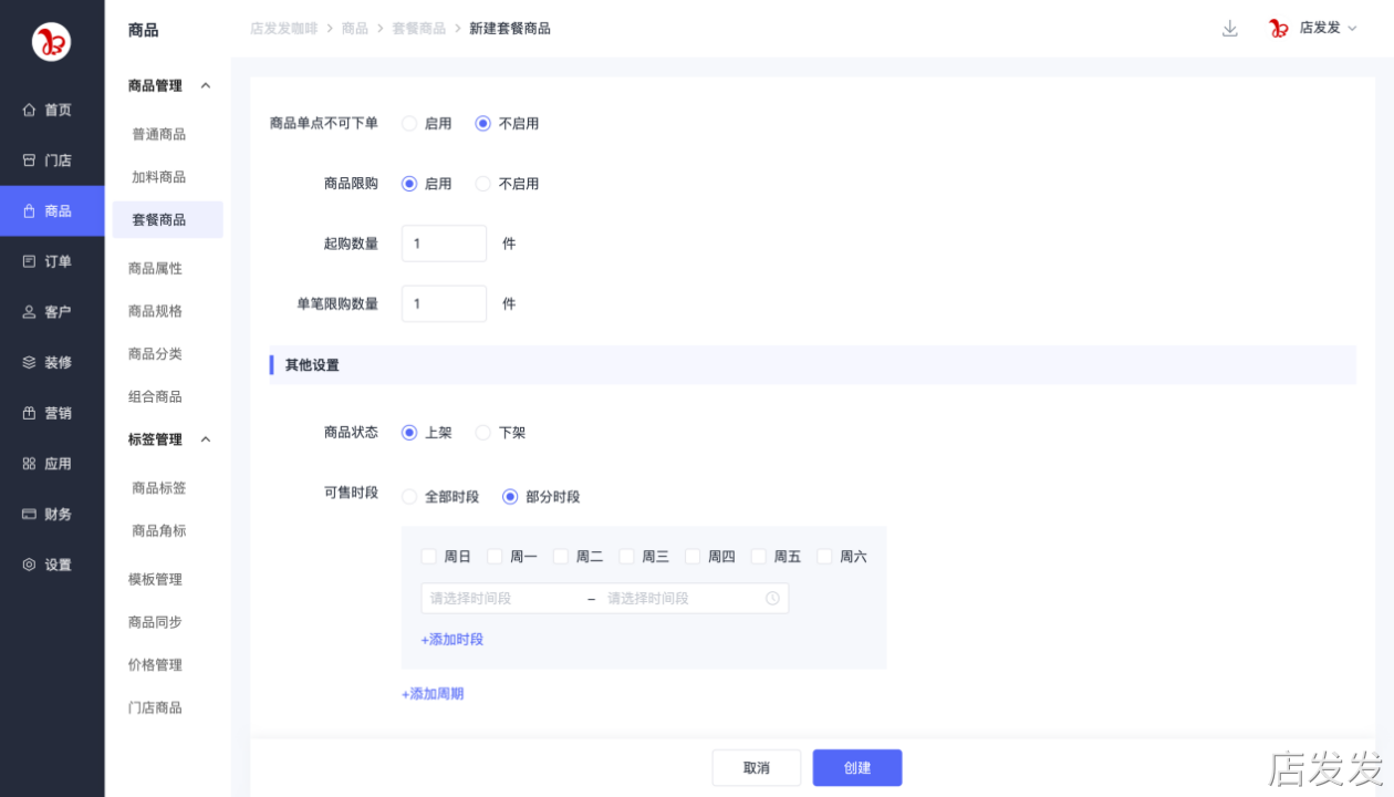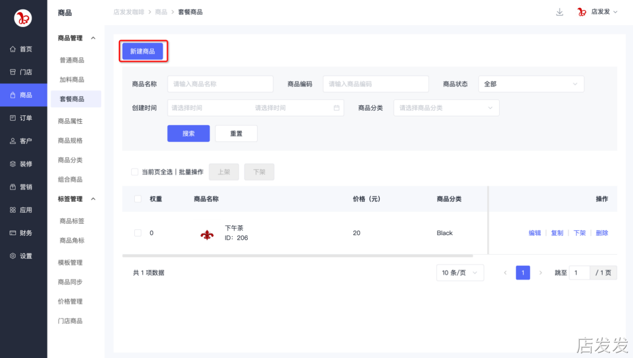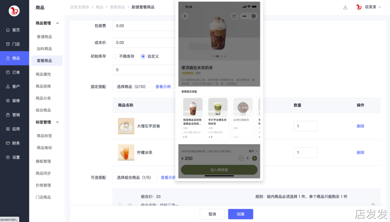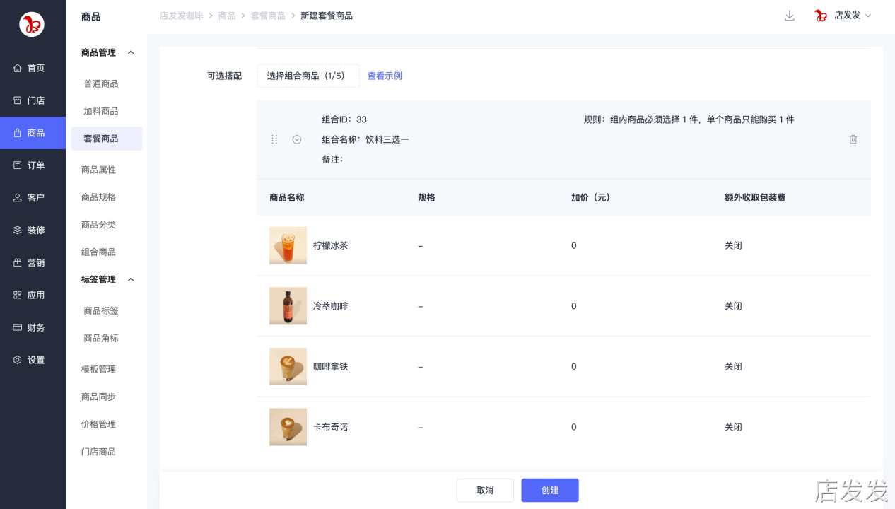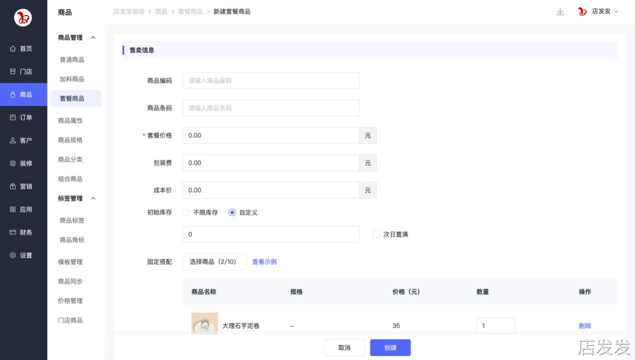 套餐商品:店发发品牌后台- 商品 - 商品管理 - 套餐商品