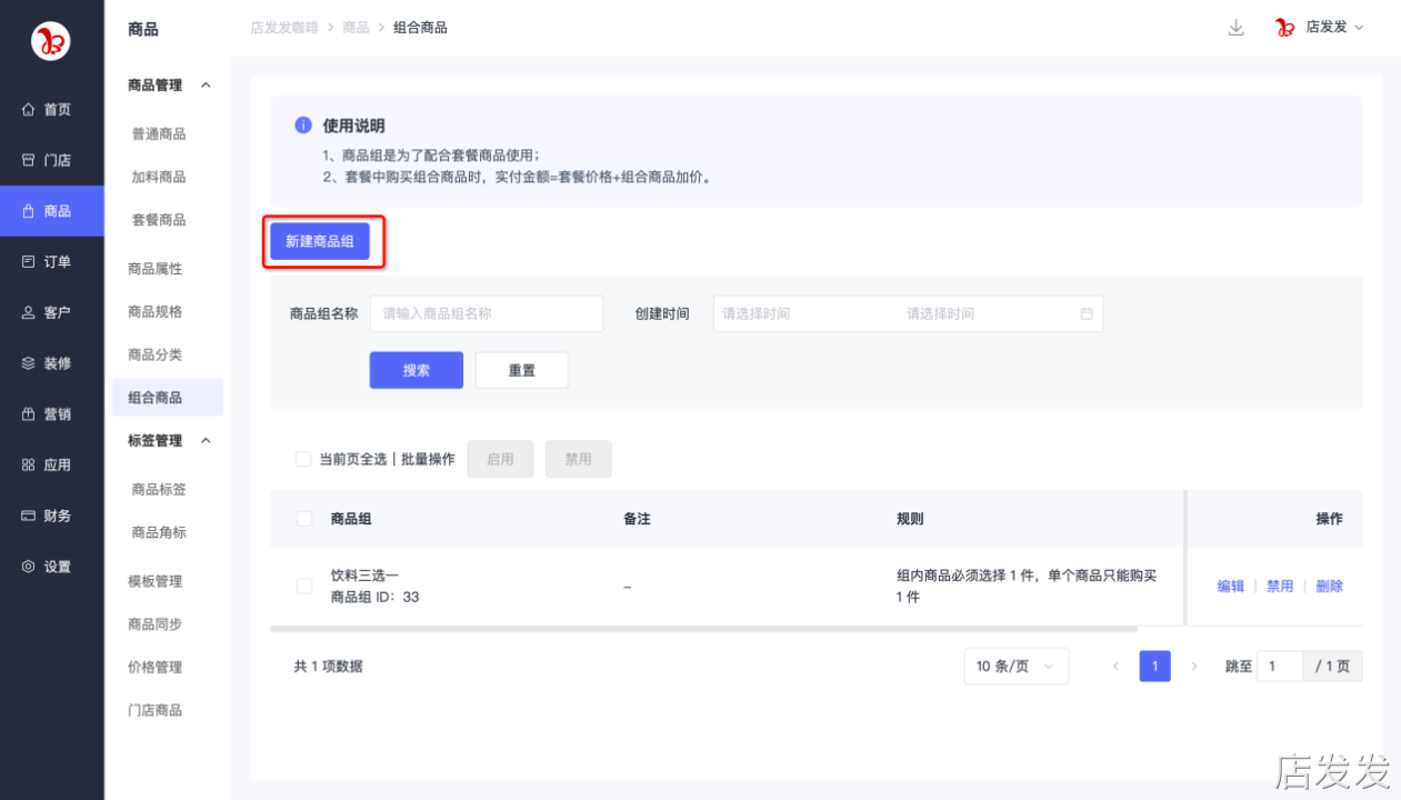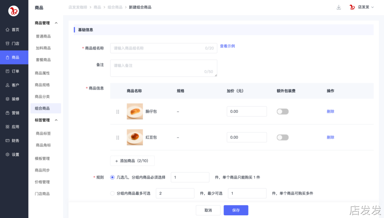 组合商品:店发发品牌后台 - 商品 - 商品管理 - 组合商品