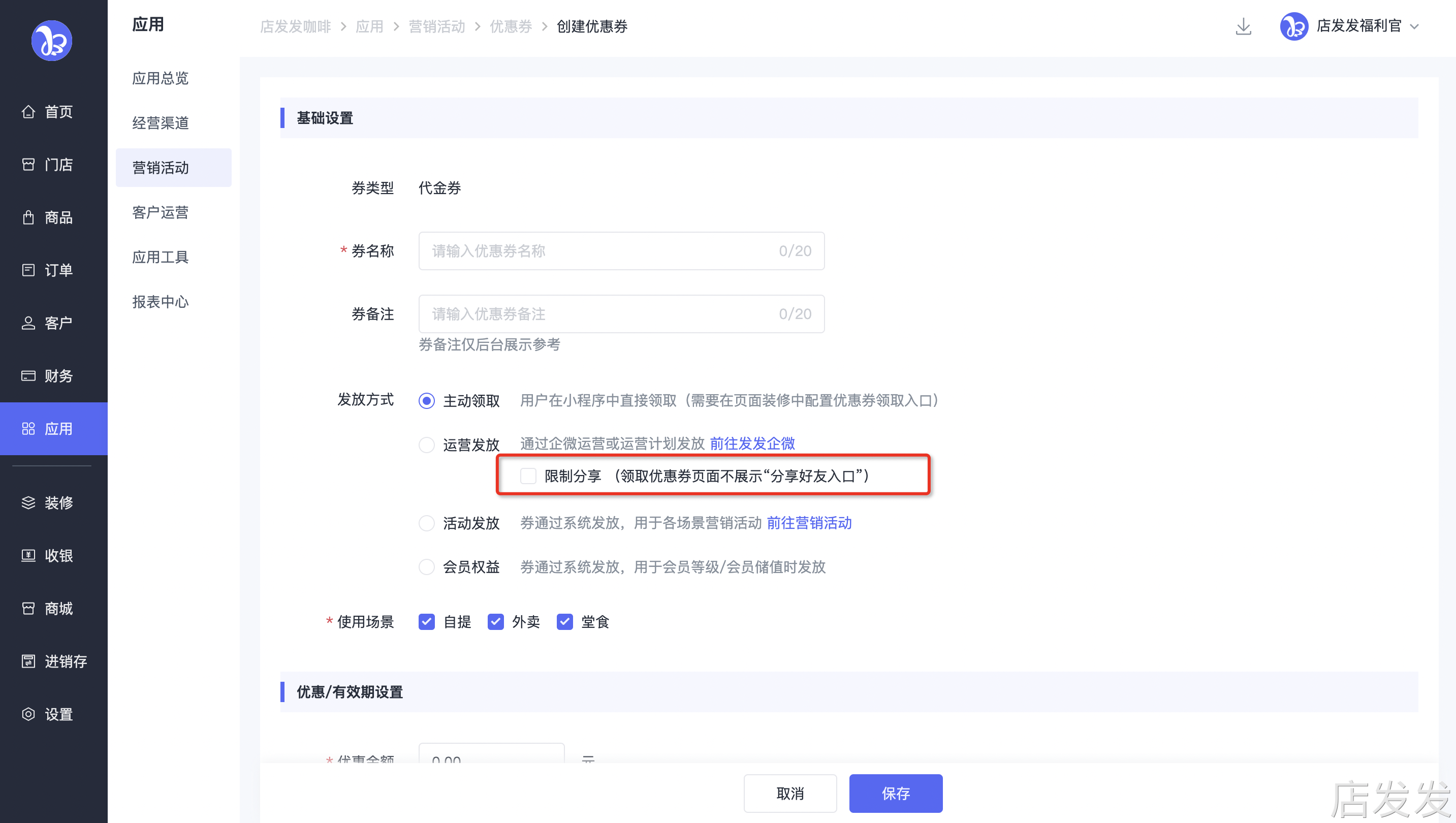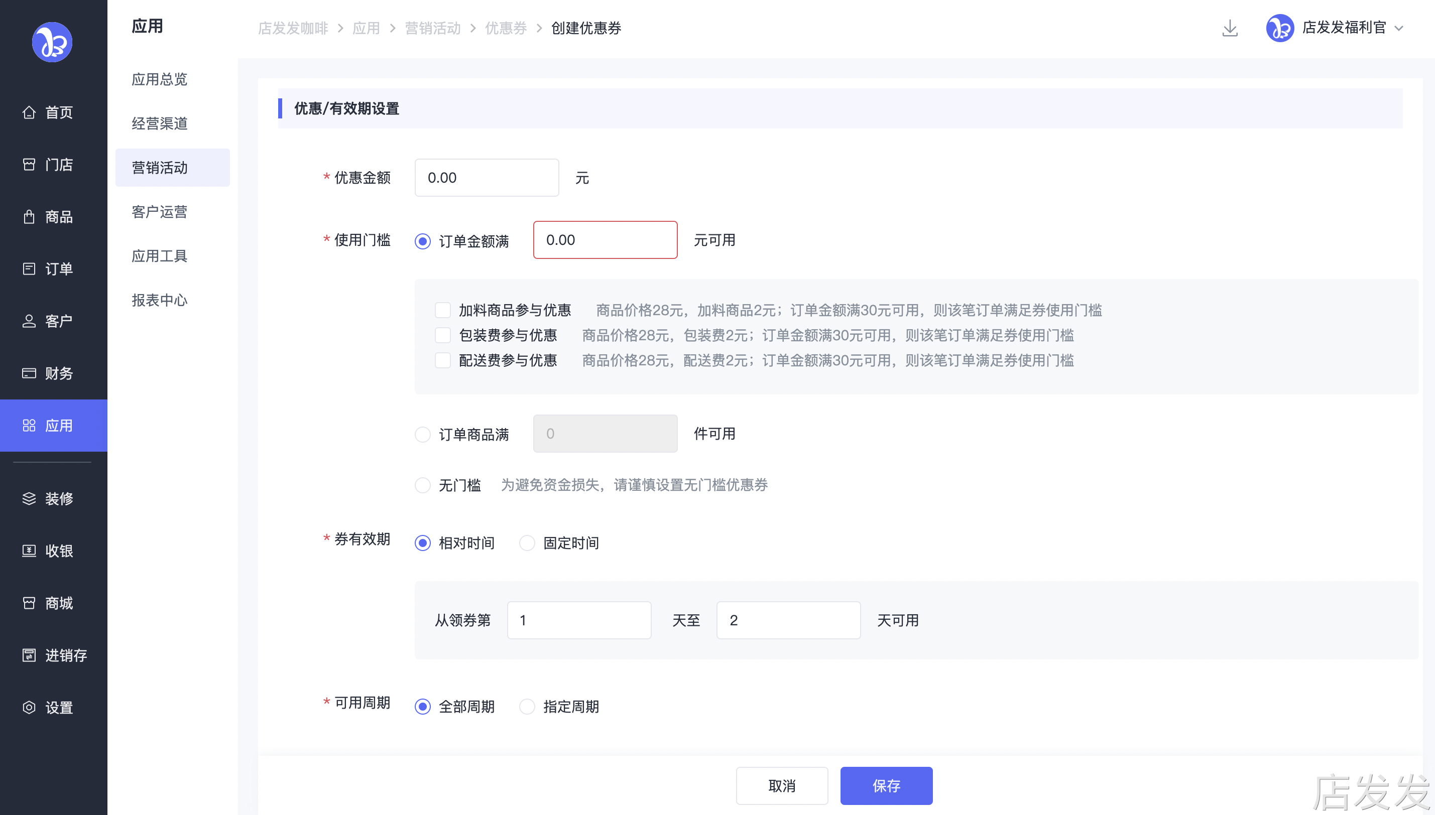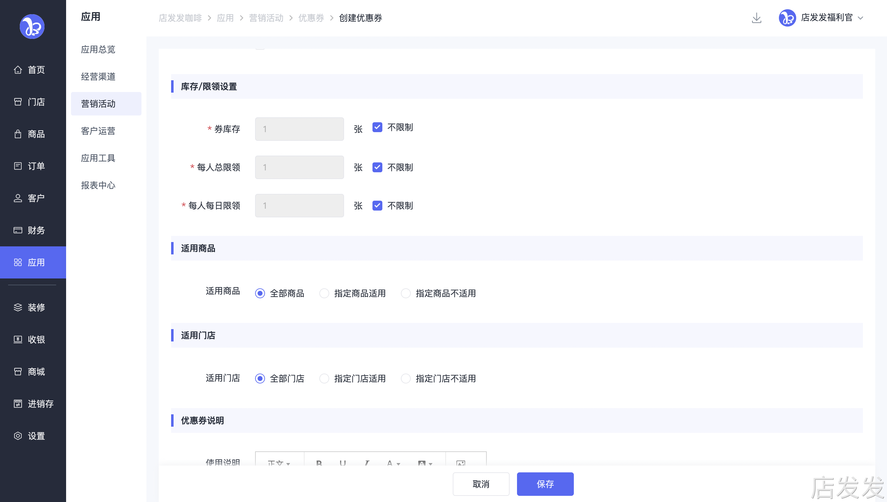 优惠券:店发发品牌后台- 应用 - 营销活动 - 优惠券