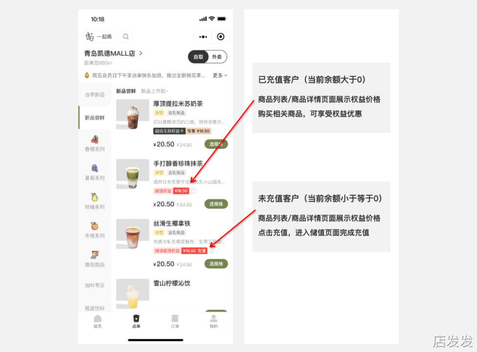 点单页面:在小程序点单页面,展示商品的原价和储值权益价格对比;