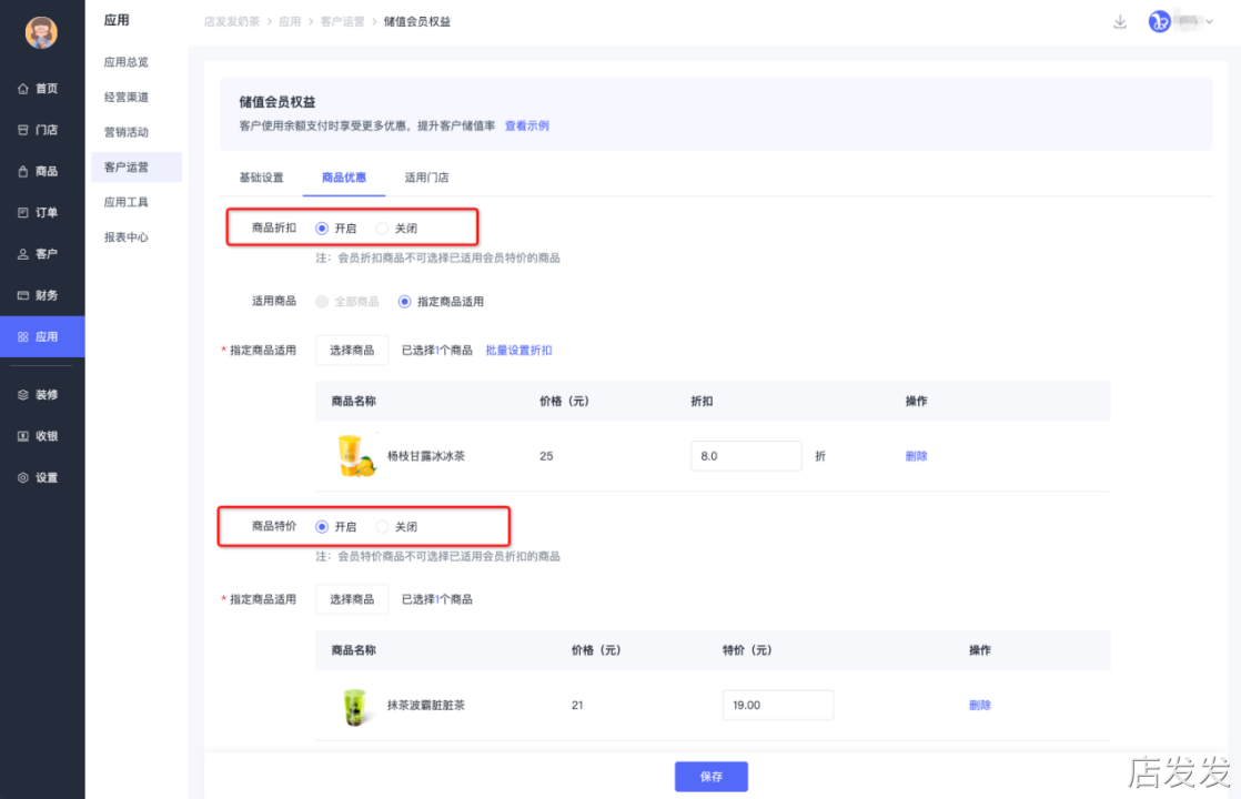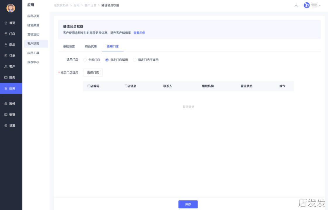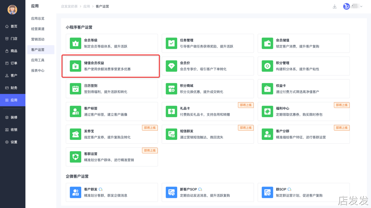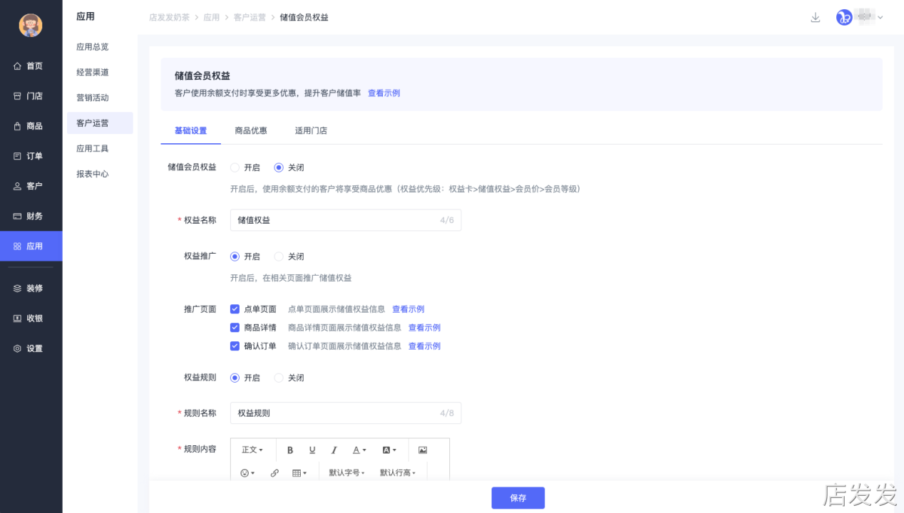 三、功能路径储值会员权益:店发发品牌后台- 应用 - 客户运营 - 储值会员权益