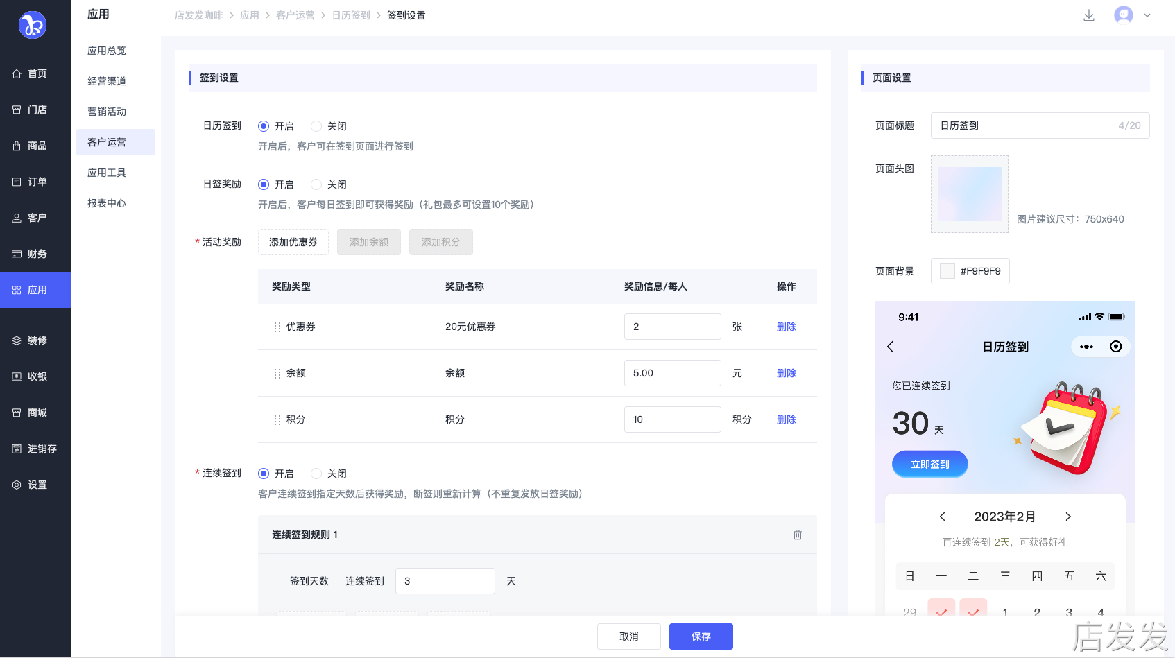 店发发品牌后台- 应用 - 客户运营 - 日历签到