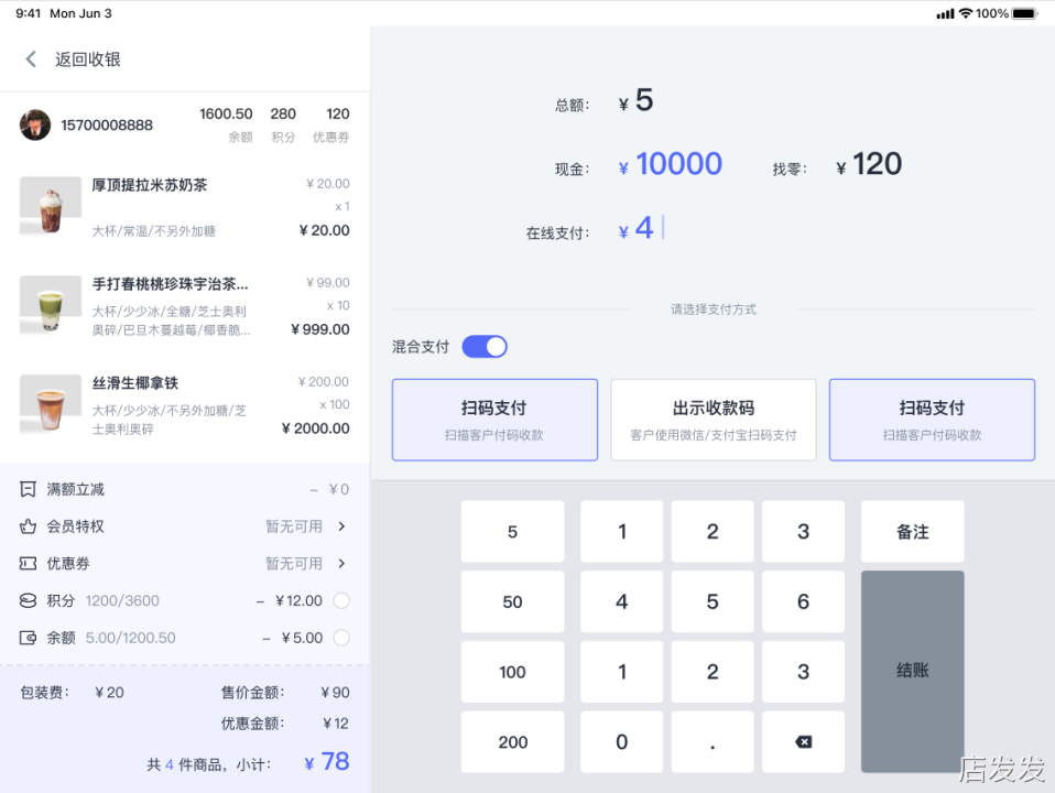 d. 混合支付:选择两种支付方式收款(如:现金+扫码支付)