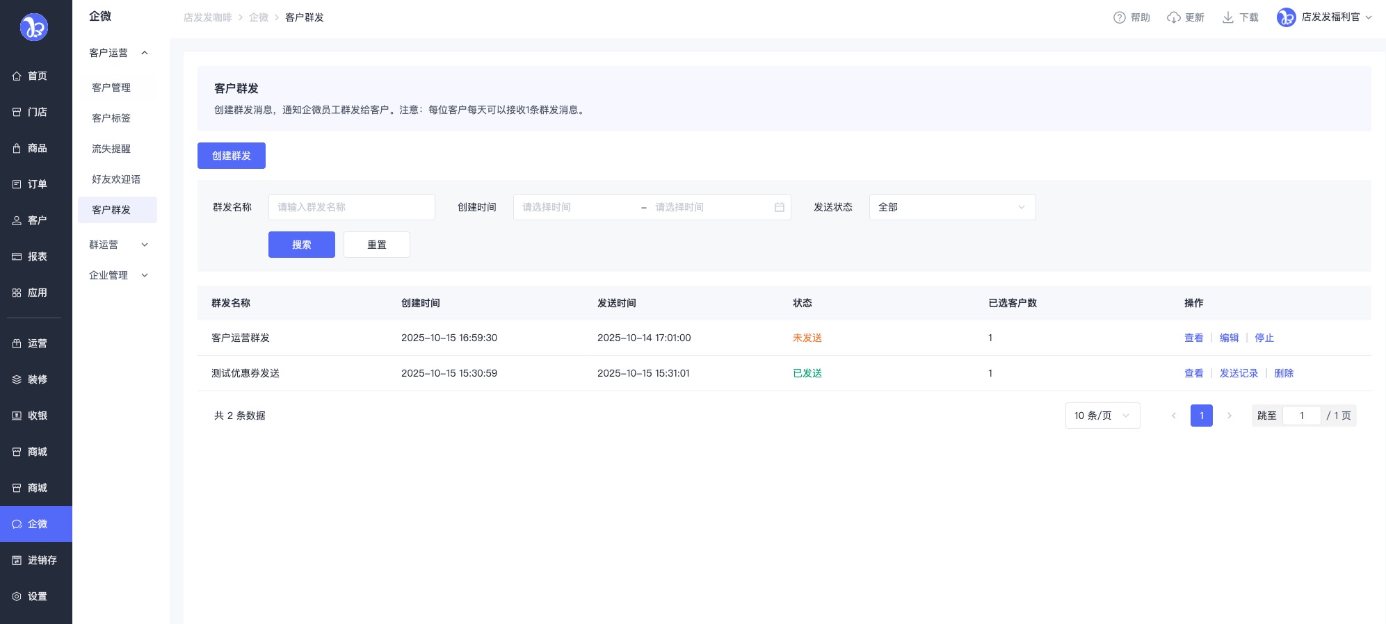 创建群发消息,通知企微员工群发给客户,并支持查看发送状态和发送记录