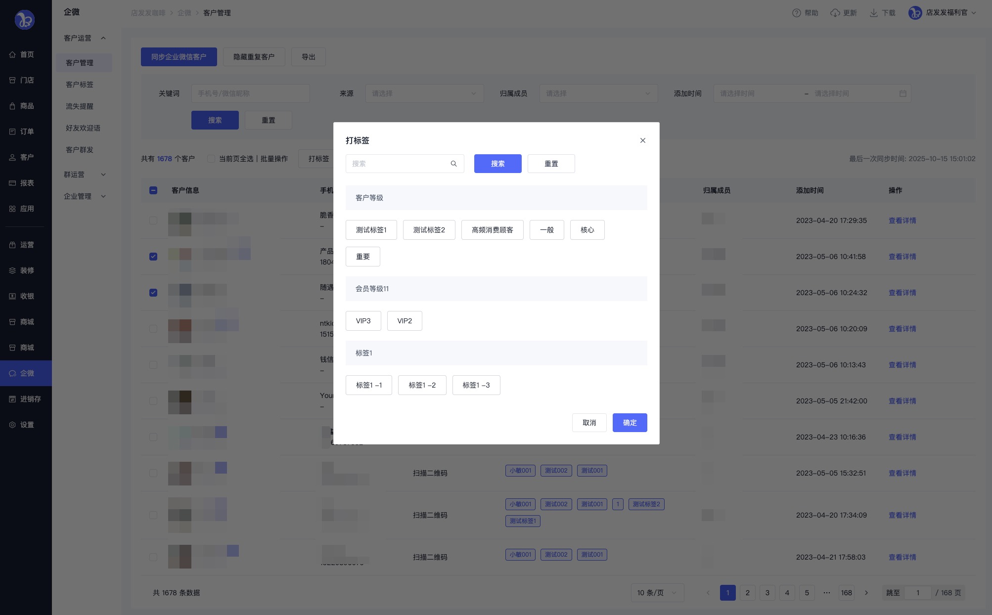 可自定义客户标签,可在管理后台或企业微信中添加或调整客户标签信息(支持一键同步企微标签);