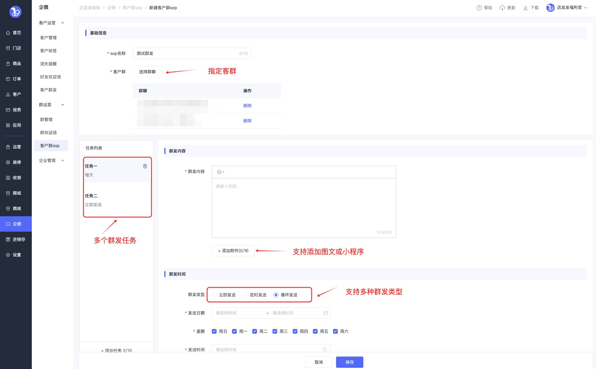 群发任务:可创建多个群发任务,可在不同时间发送不同内容