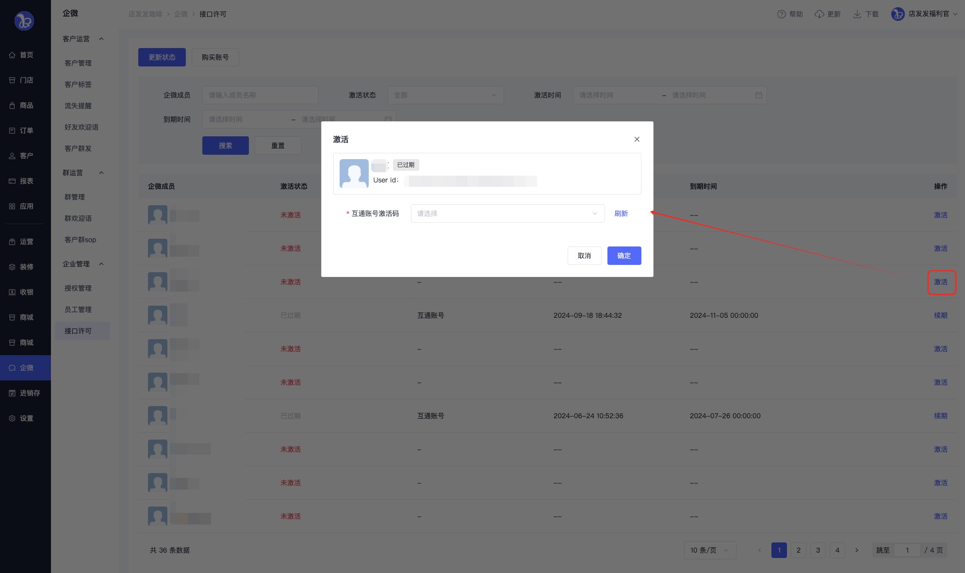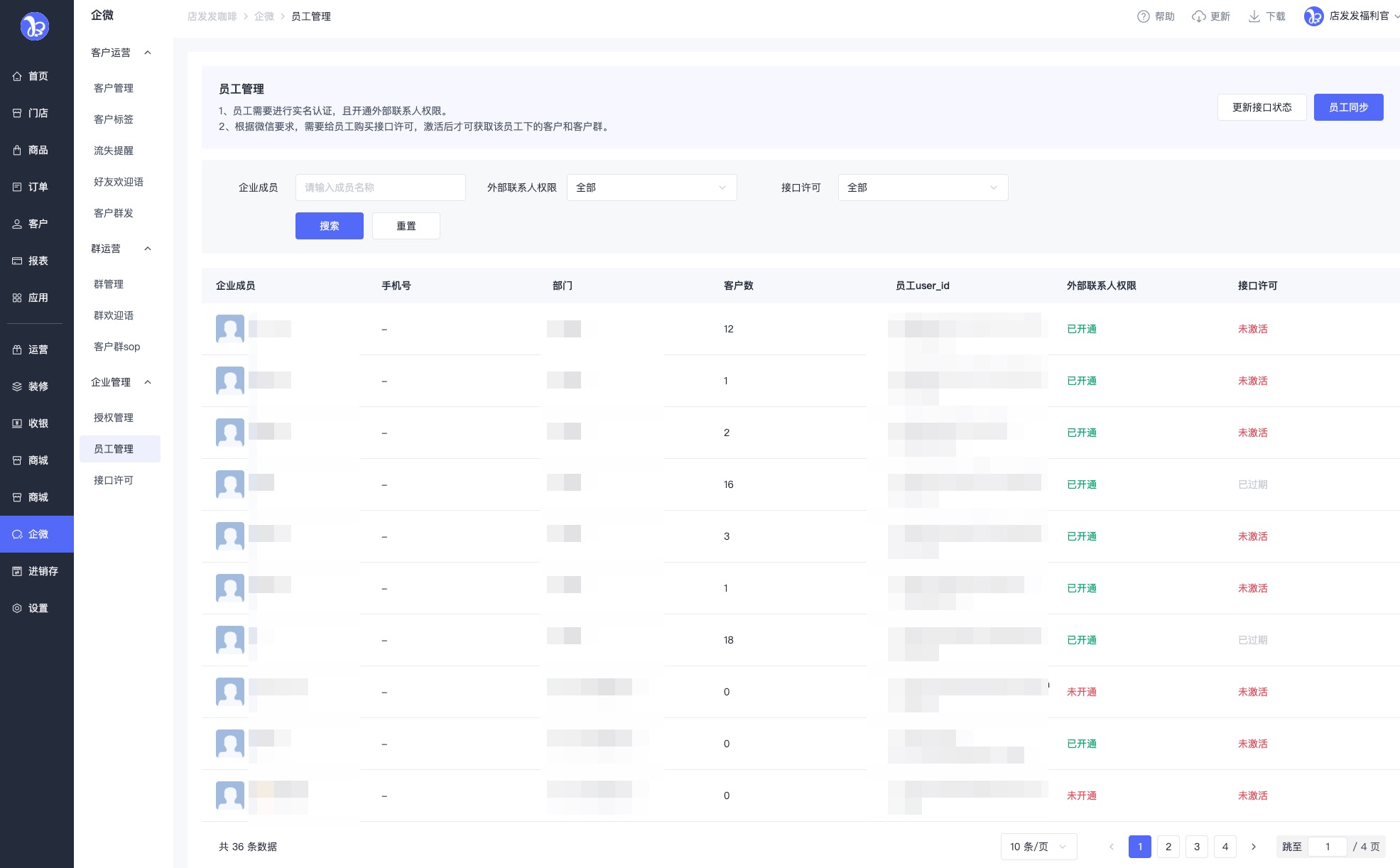 根据微信要求,需要给员工购买接口许可,激活后才可获取该员工下的客户和客户群。