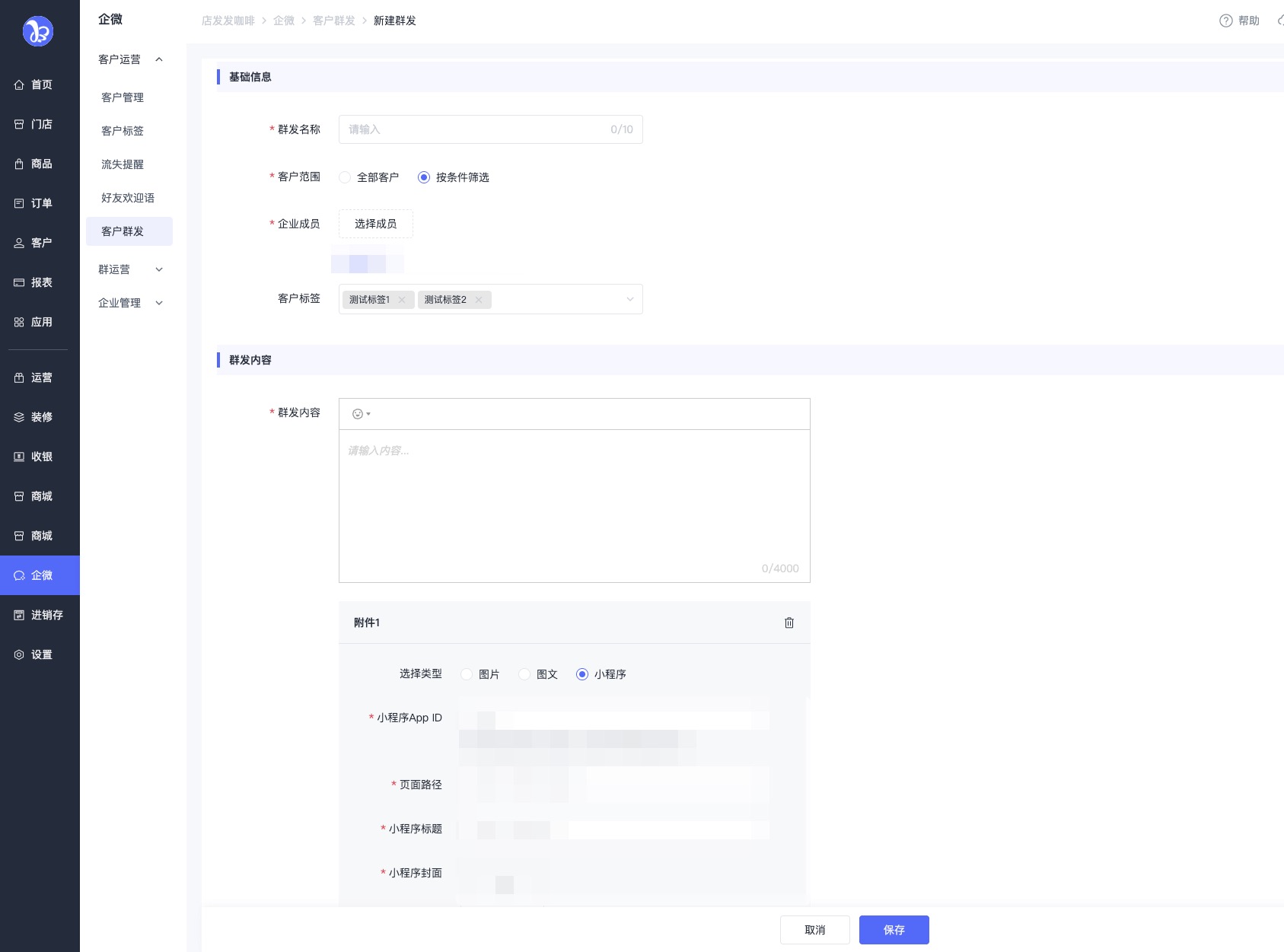 群发内容:支持图片,图文和小程序链接(包含优惠券链接)