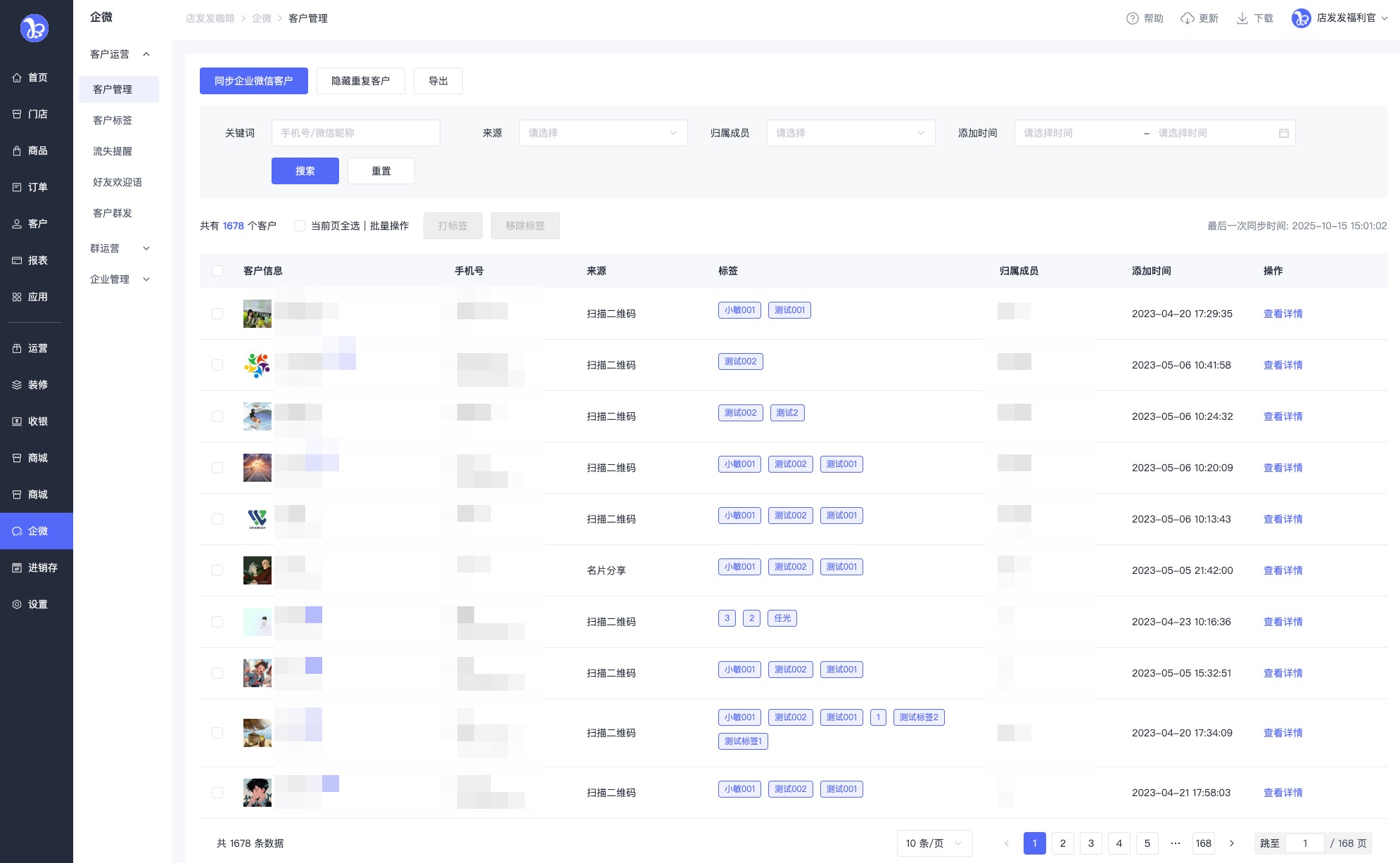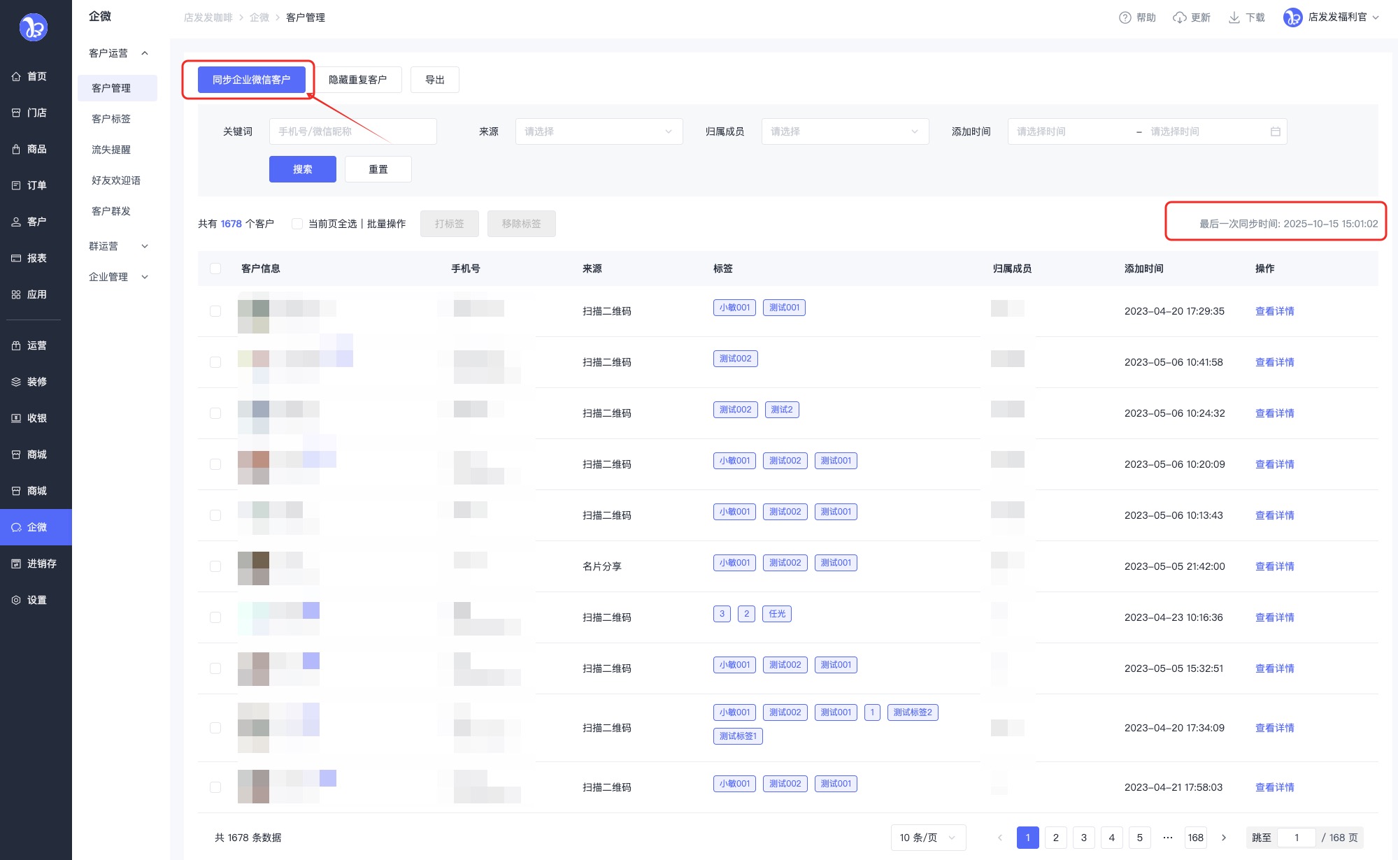 一键同步企业微信客户,可根据来源、归属成员等筛选条件查看相关客户信息;