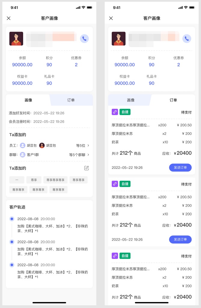 客户画像:可在企业微信客户聊天界面,查看客户详情,发送商品、优惠券等营销素材。