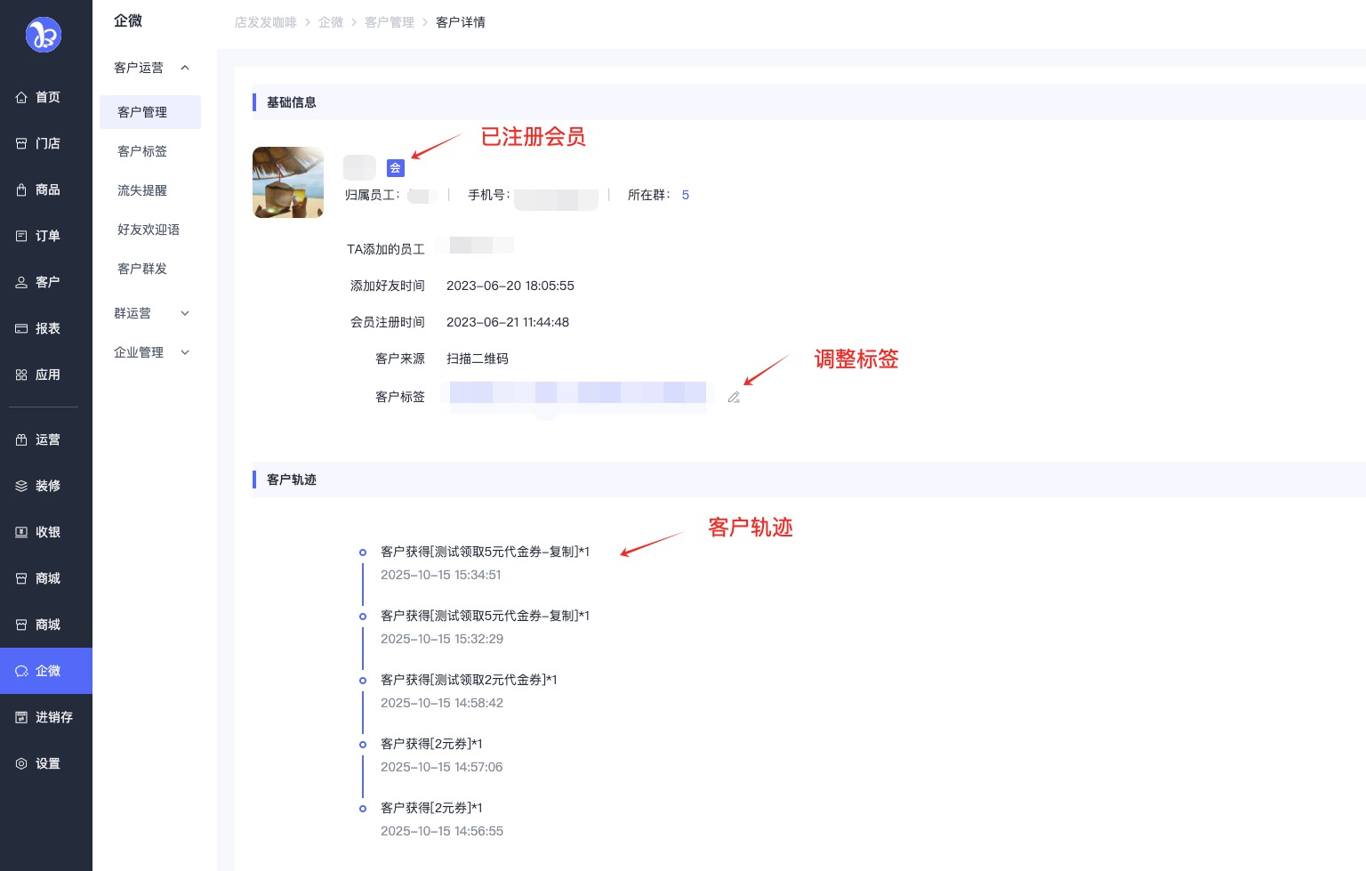 客户详情记录是否已注册会员、客户归属员工、所在群、客户来源等基础信息,并可查看客户轨迹信息;