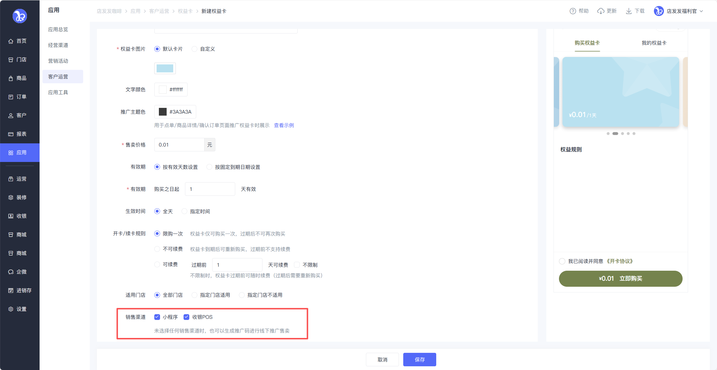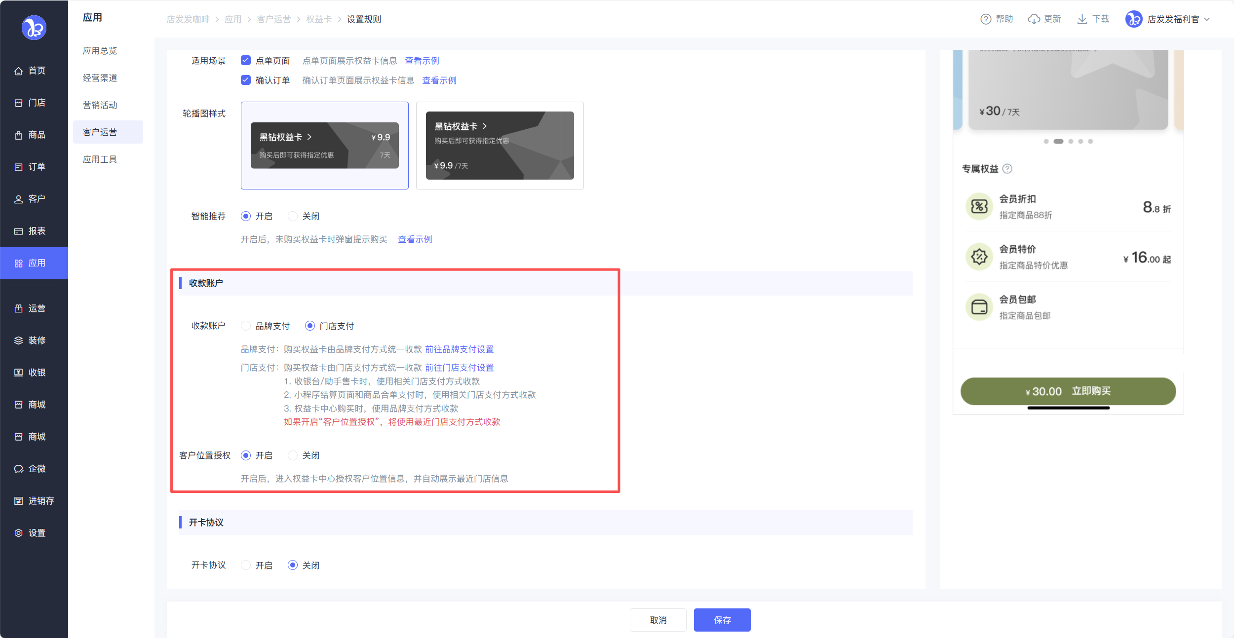 路径:品牌后台-应用-客户运营-权益卡-设置规则