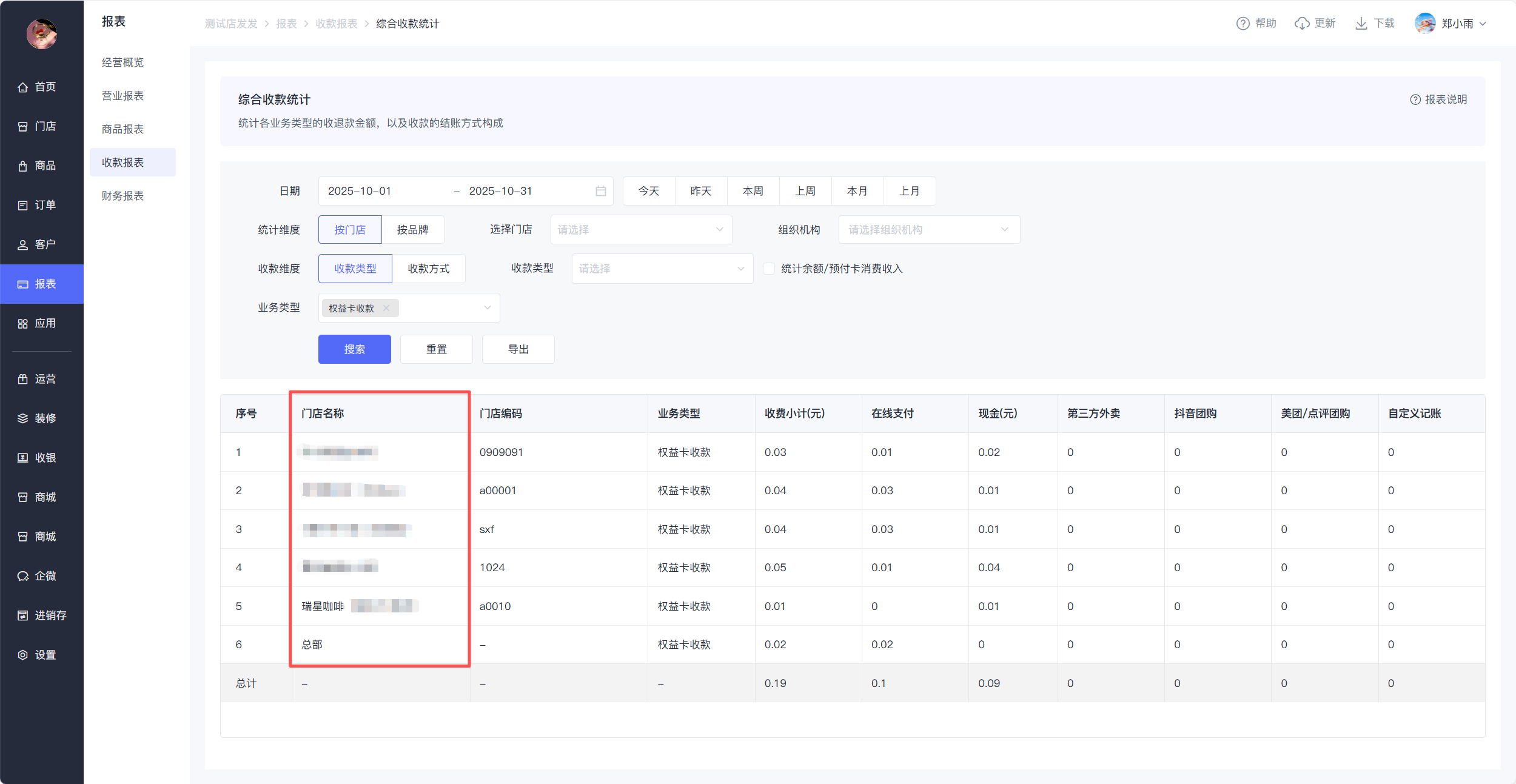 在经营概览、支付明细、综合收款统计等数据中,权益卡业务无归属门店的收款金额,展示“总部”,有归属门店的收款金额,展示“门店名称”。