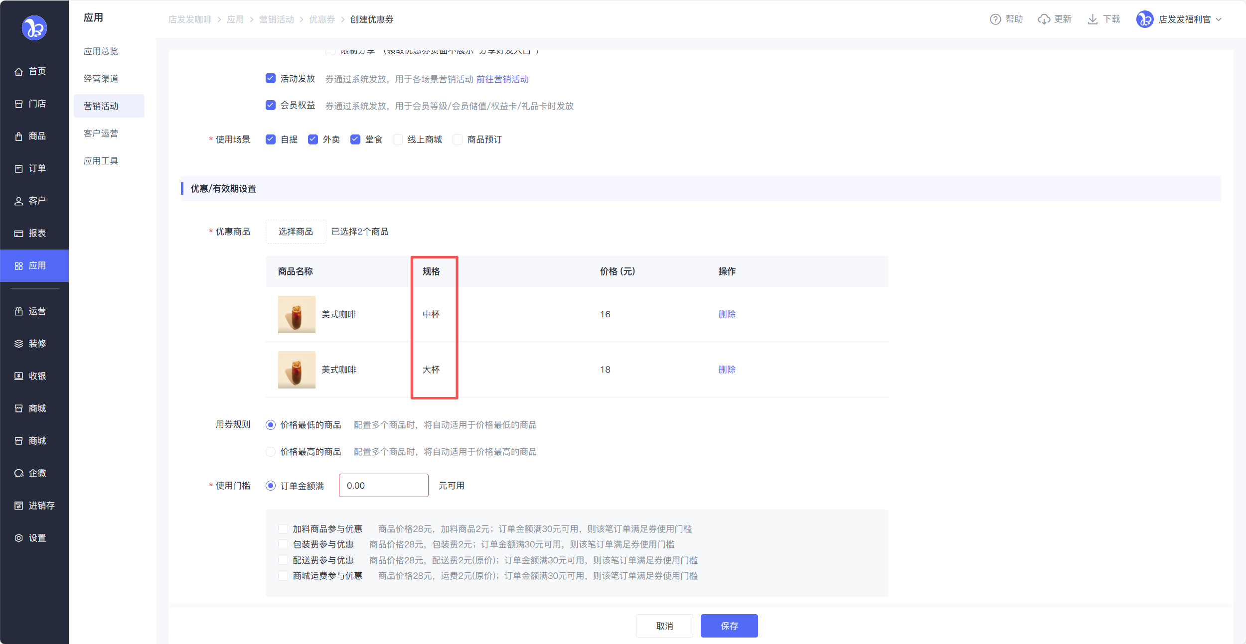 对于多规格商品,支持仅某个规格商品(中杯/大杯等)适用商品券.
