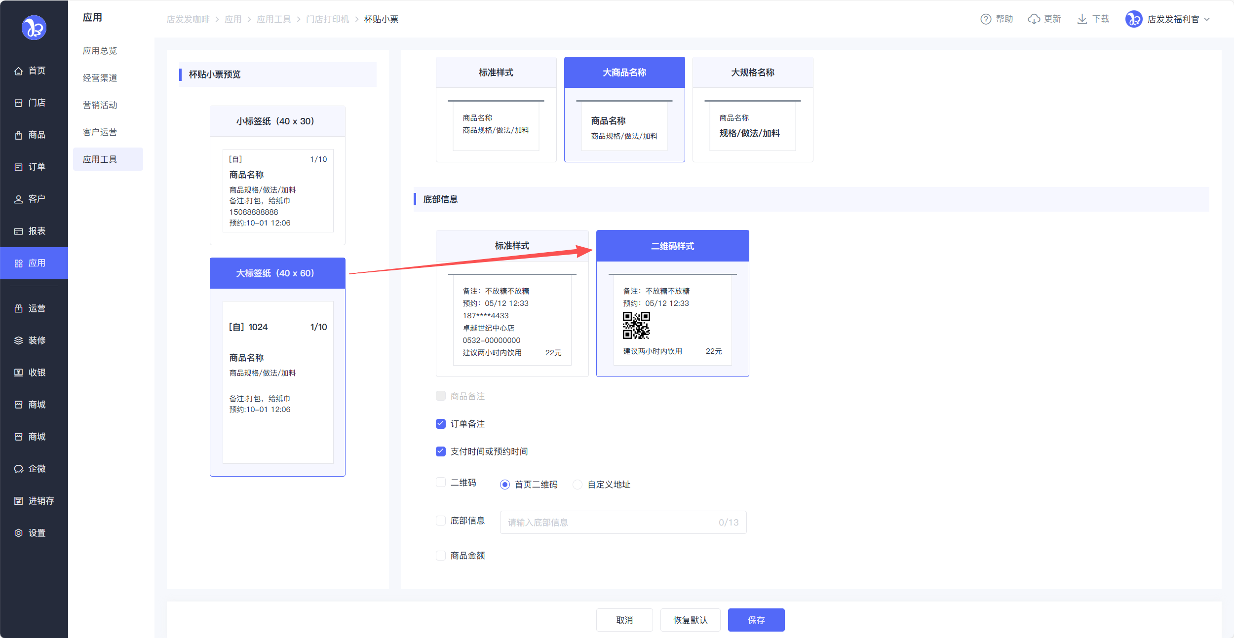 路径:品牌后台-应用-应用工具-门店打印机-杯贴小票