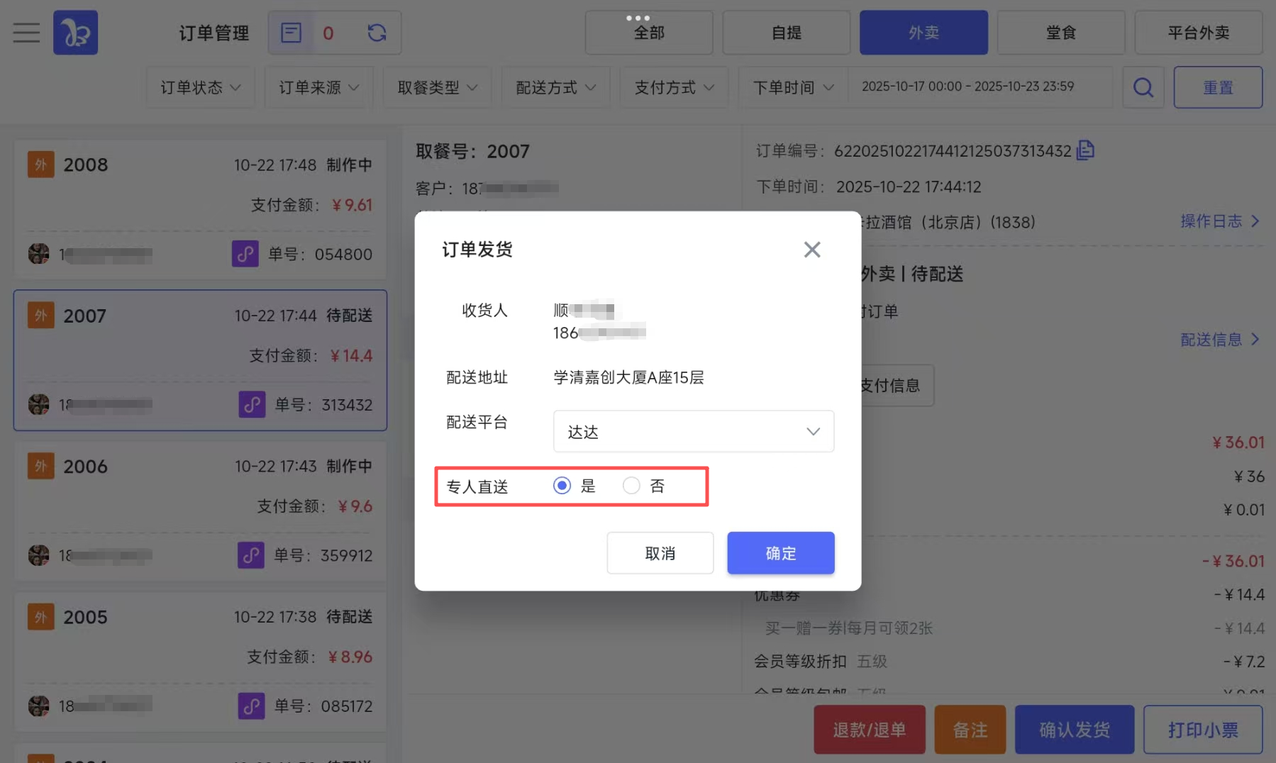 顺丰和达达配送平台新增专人直送选项,可进一步保障配送效率。