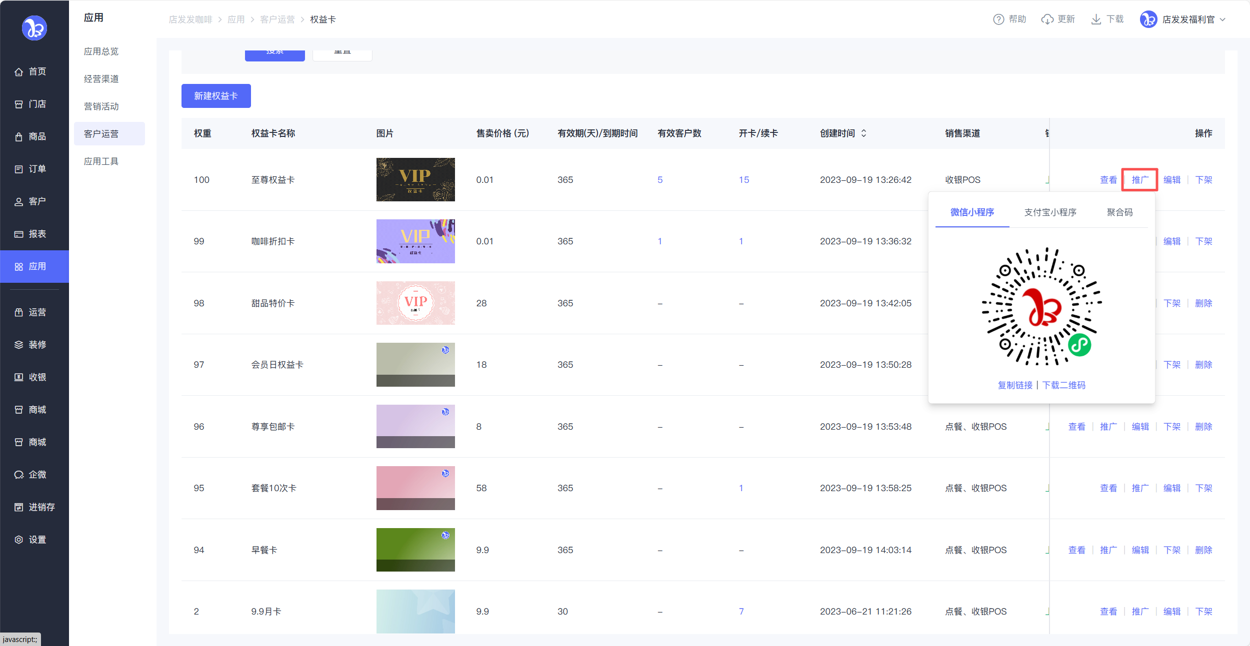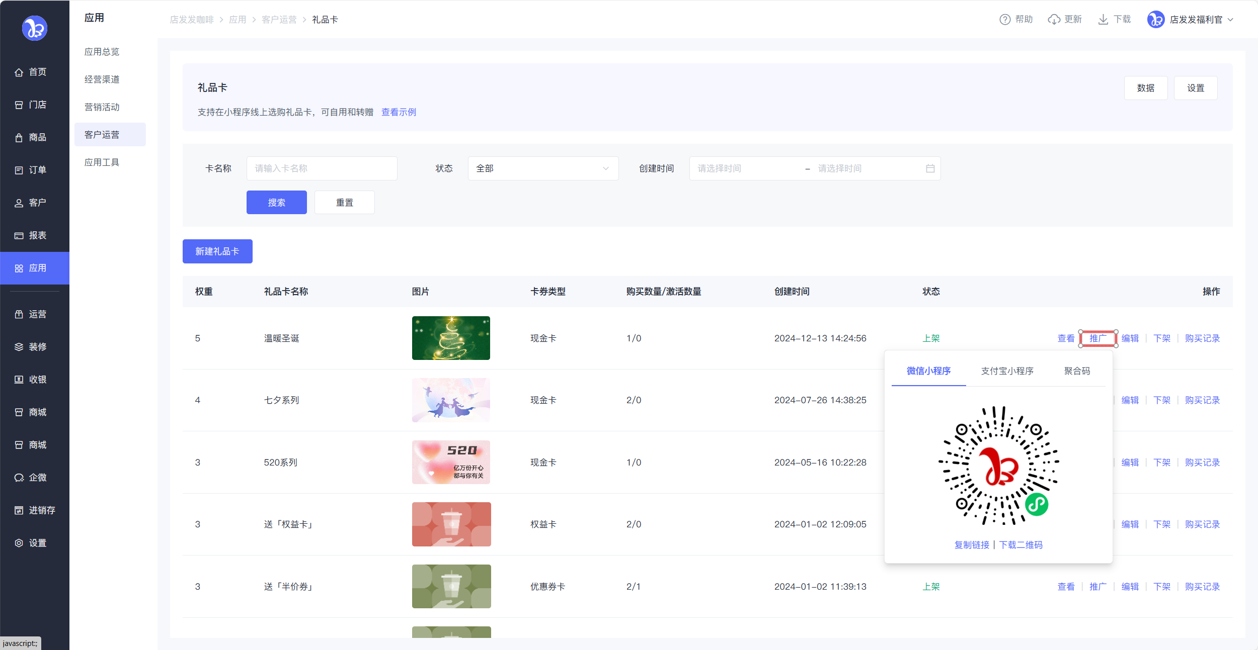 路径:品牌后台-应用-客户运营-权益卡/礼品卡