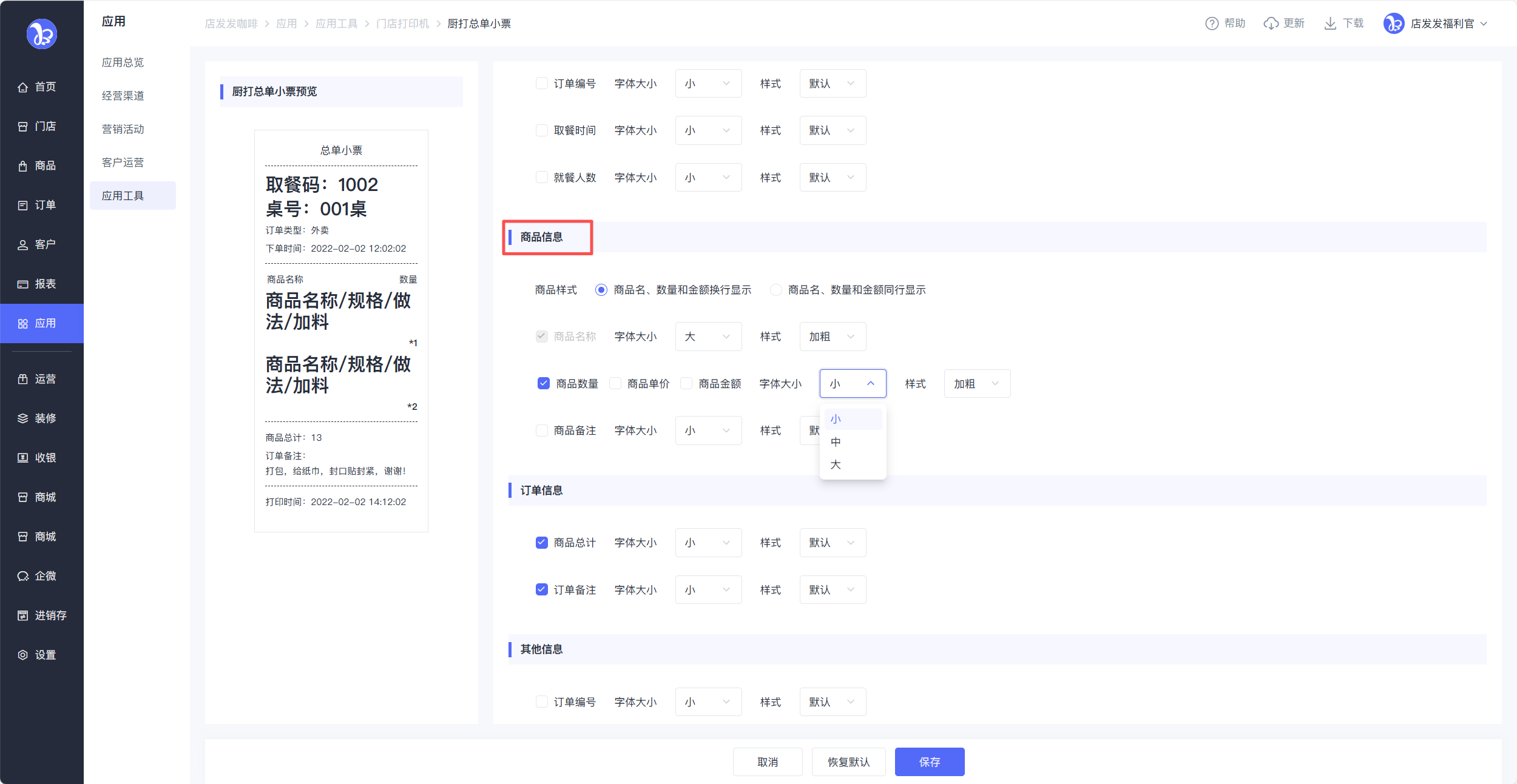 厨打小票的商品信息栏,可以自主调节小中大几种字号。