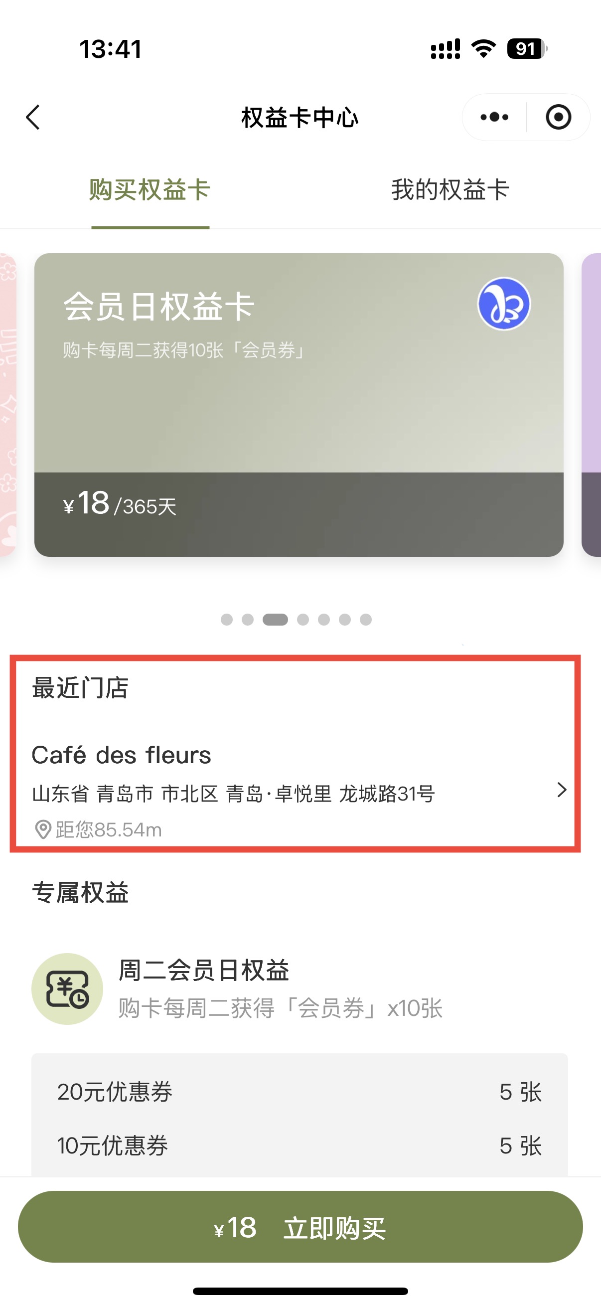可选择品牌支付或门店支付,选择“门店支付”时,展示「客户位置授权」选项,用户开启授权后,购卡页面展示最近门店信息。
