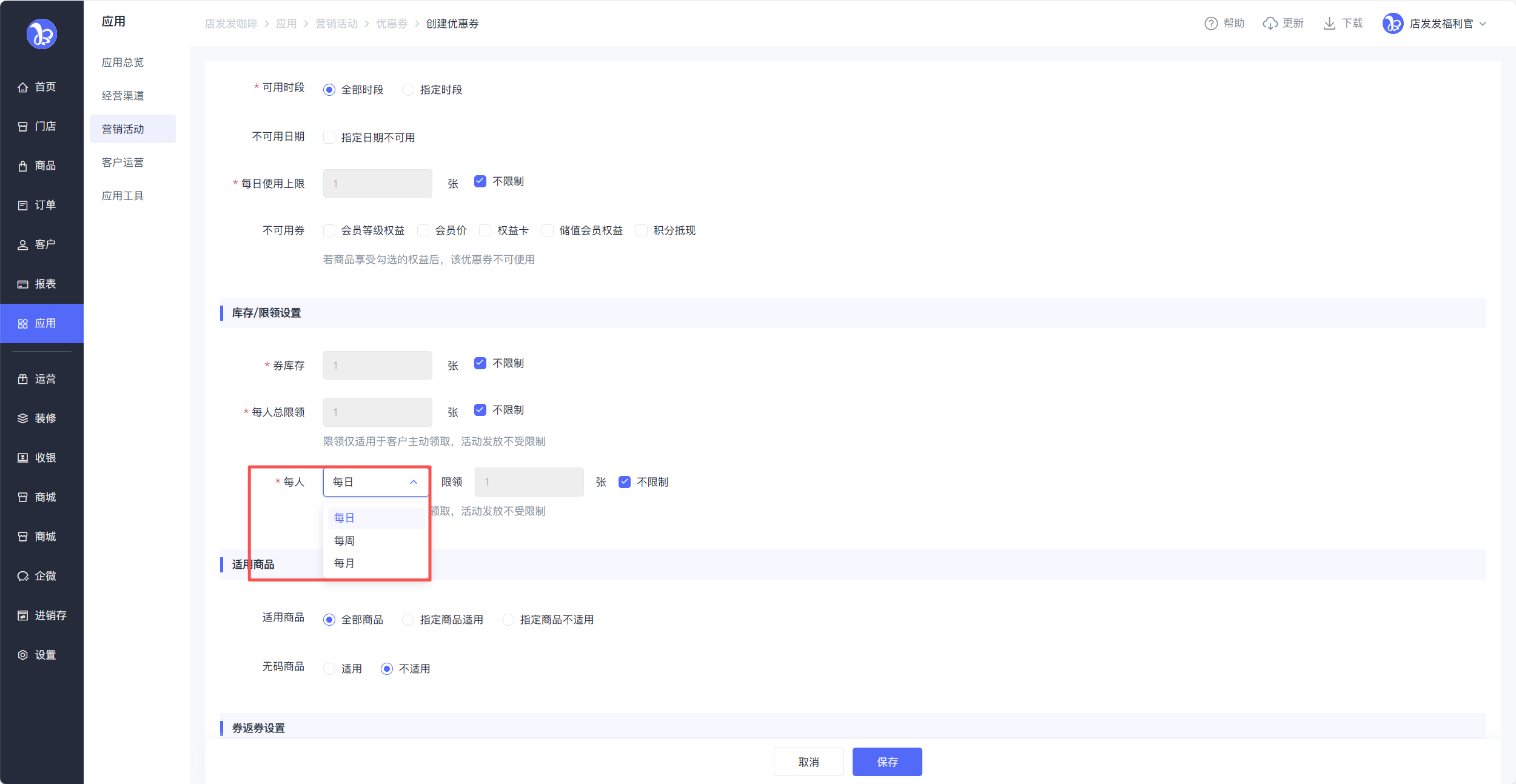 路径:品牌后台-应用-营销活动-优惠券-商品券