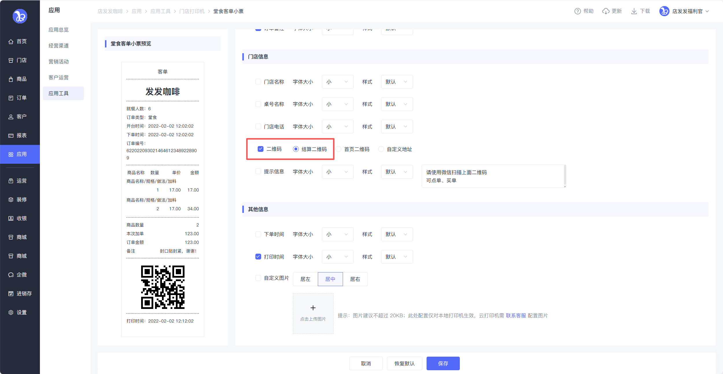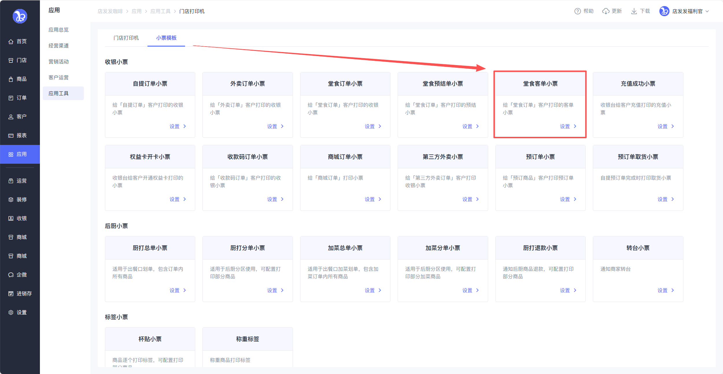 路径:品牌后台-应用-应用工具-门店打印机-堂食客单小票