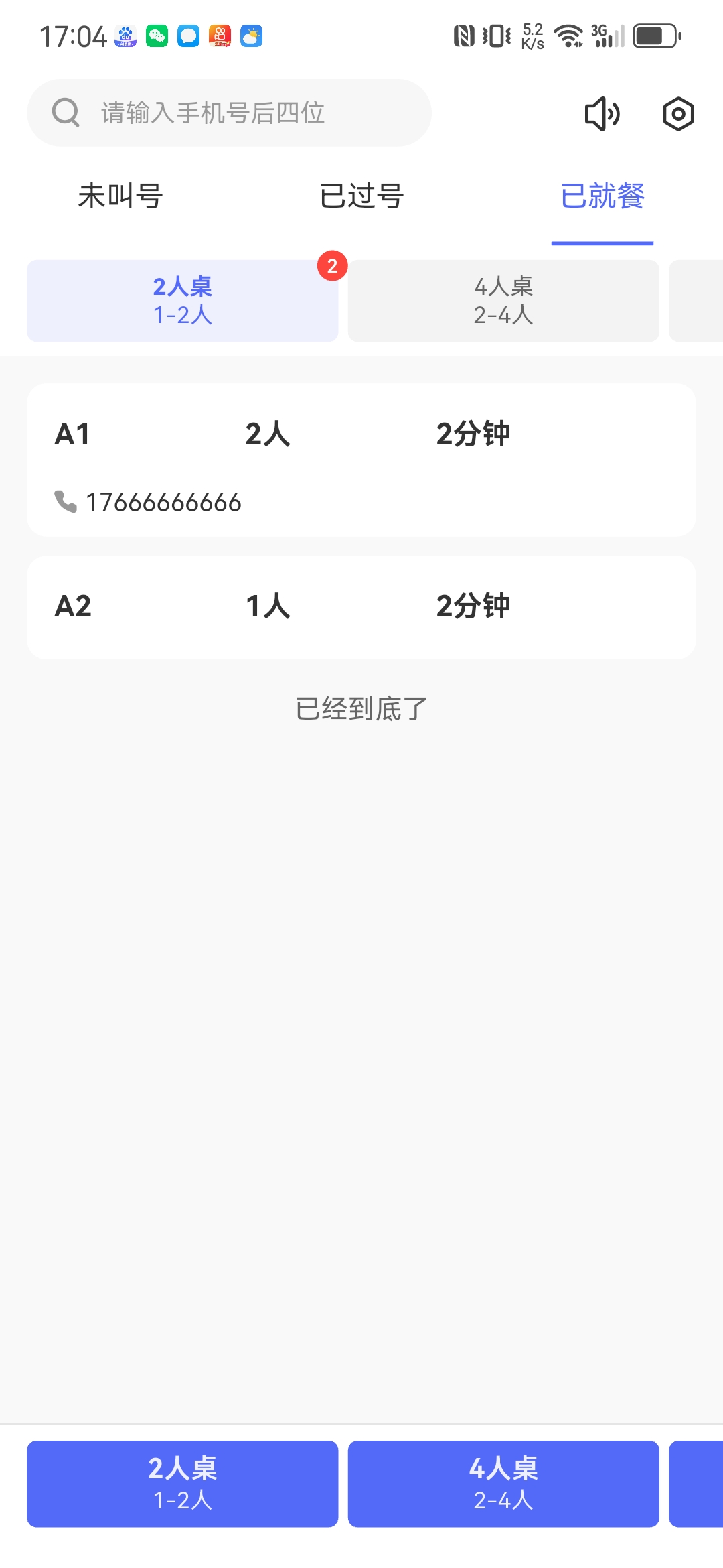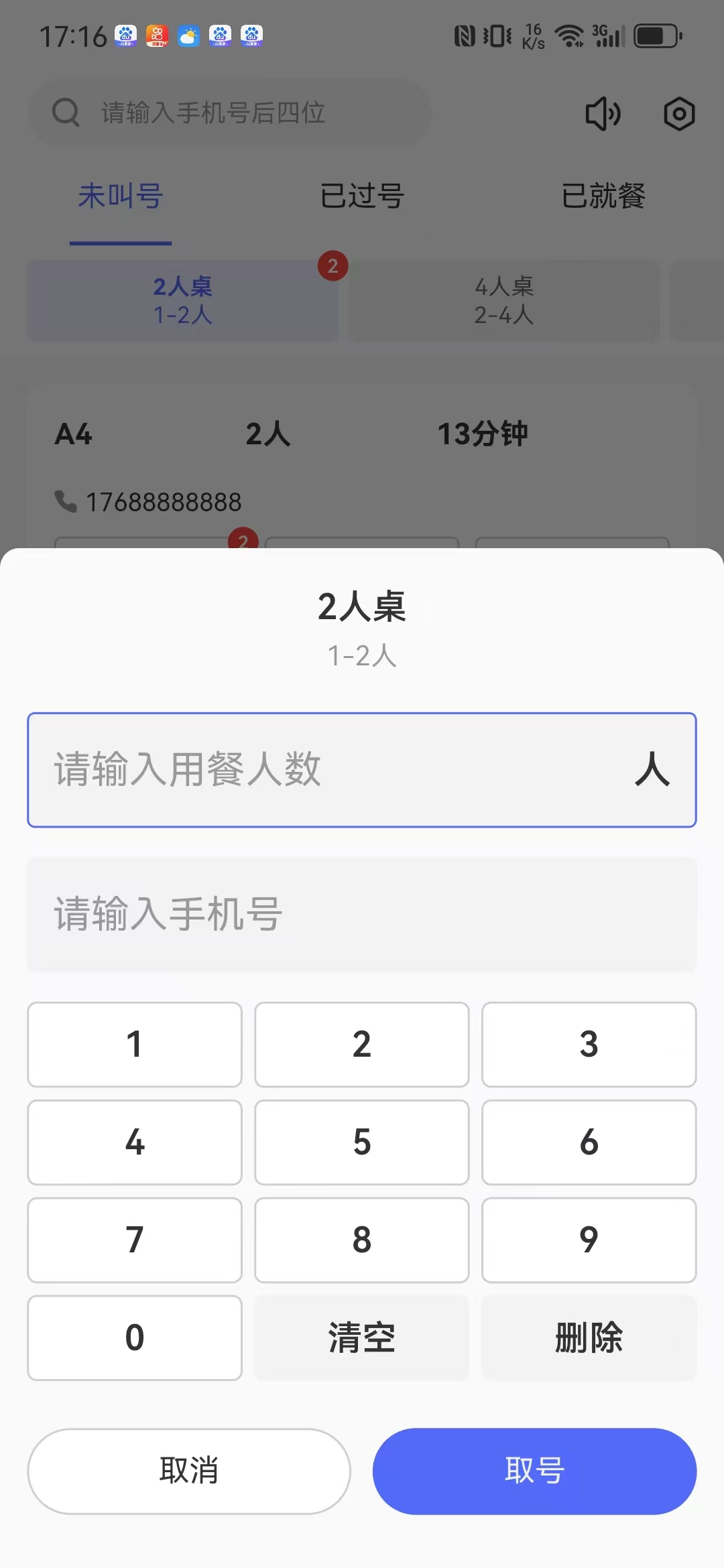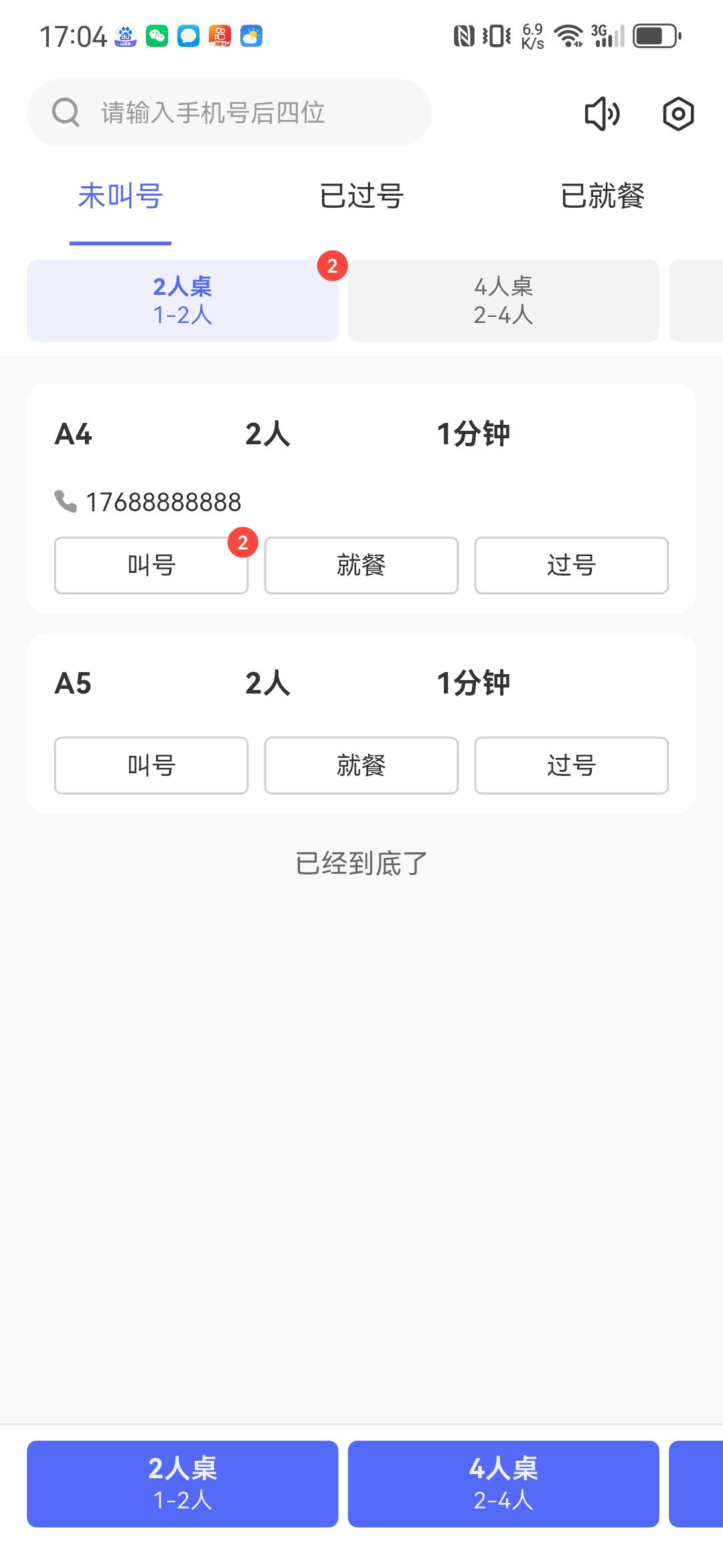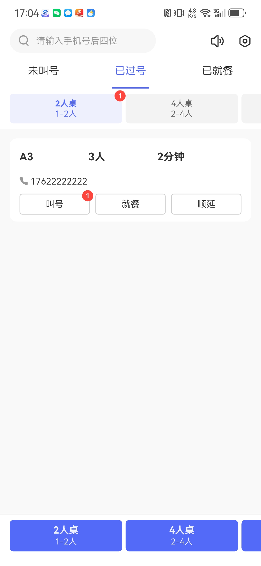 商家可管理当前排队情况,并进行叫号、就餐、过号处理。