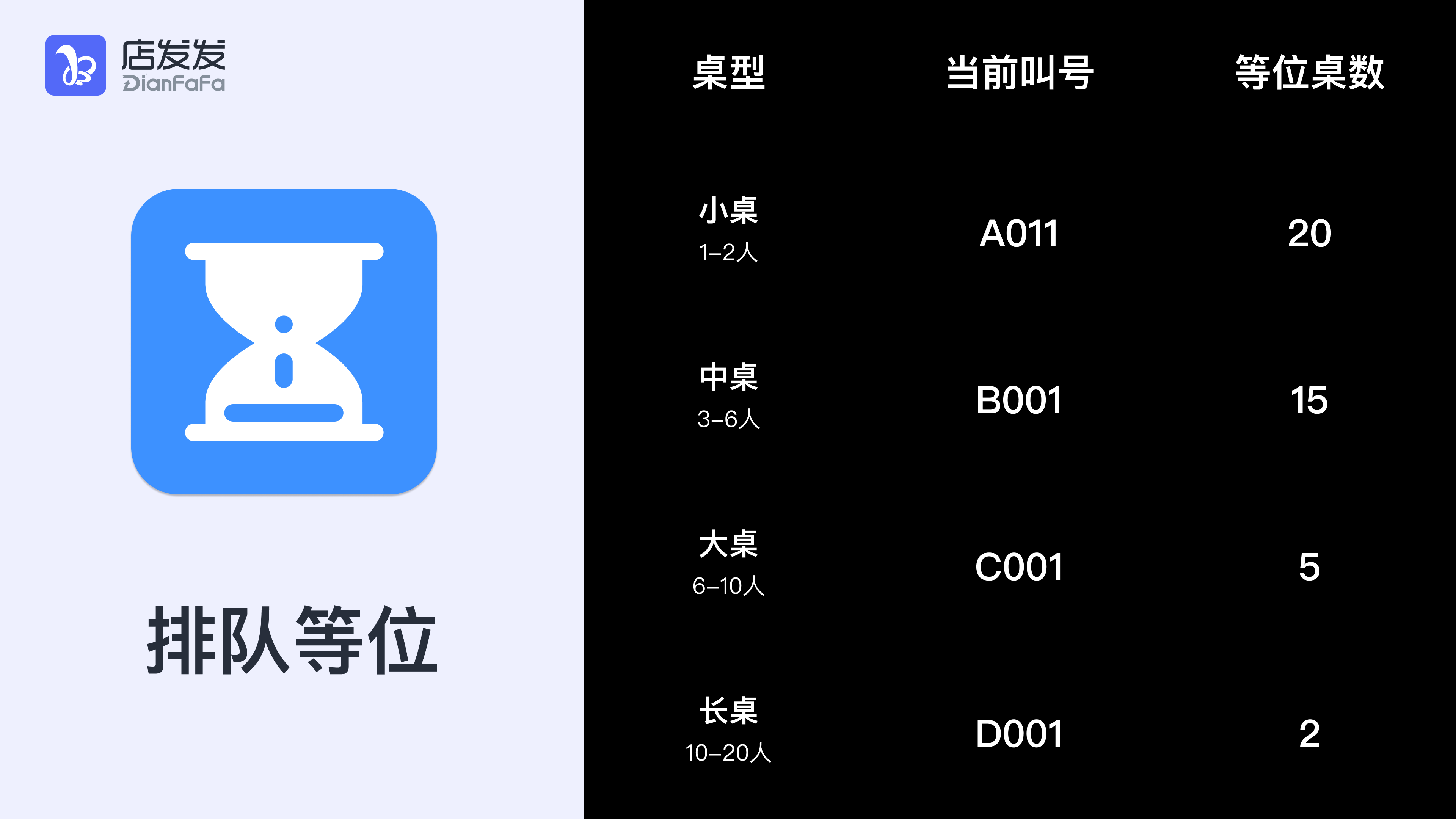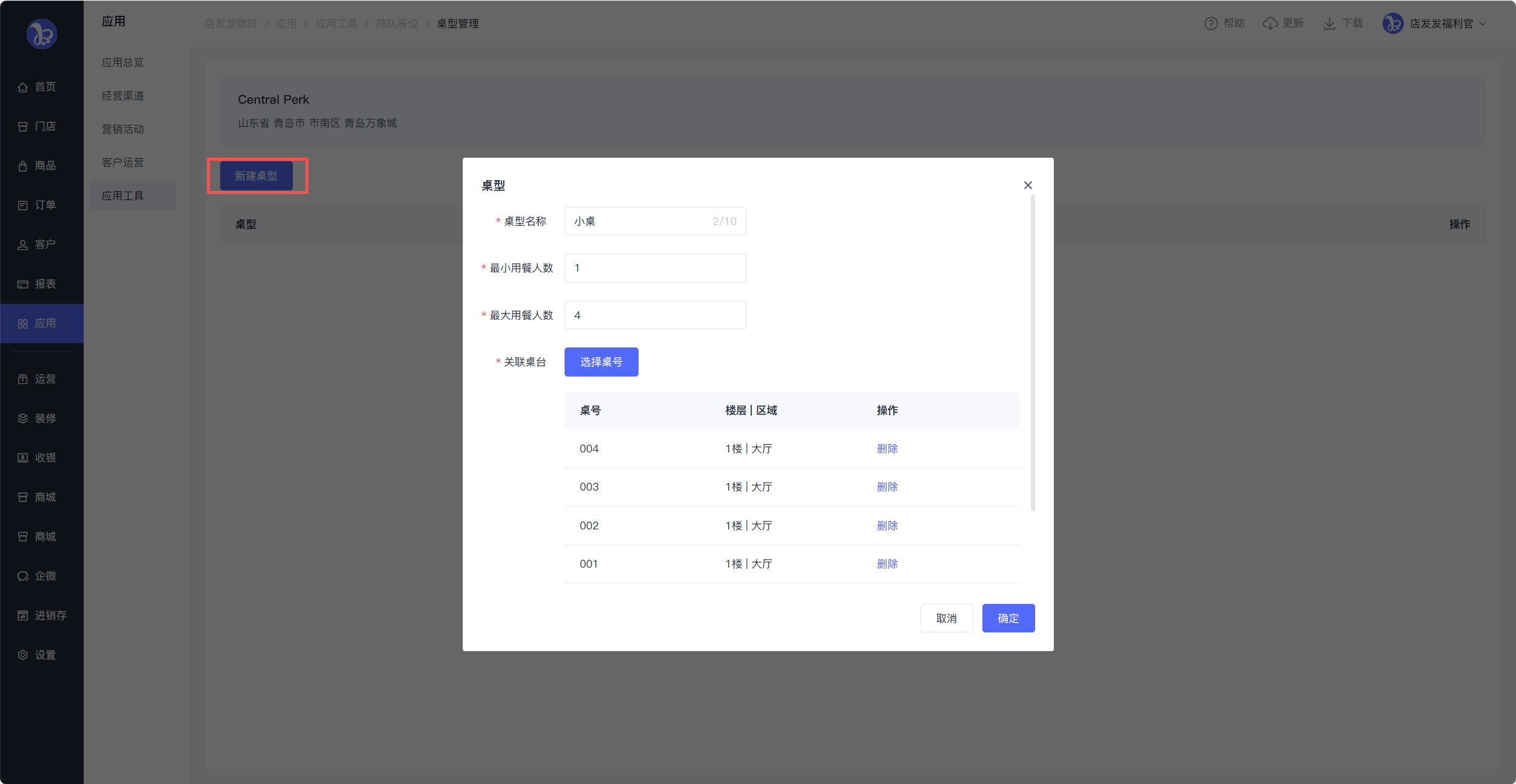 设置桌台类型(小/中/大)、用餐人数、关联桌台、每桌等待时长、排号前缀。