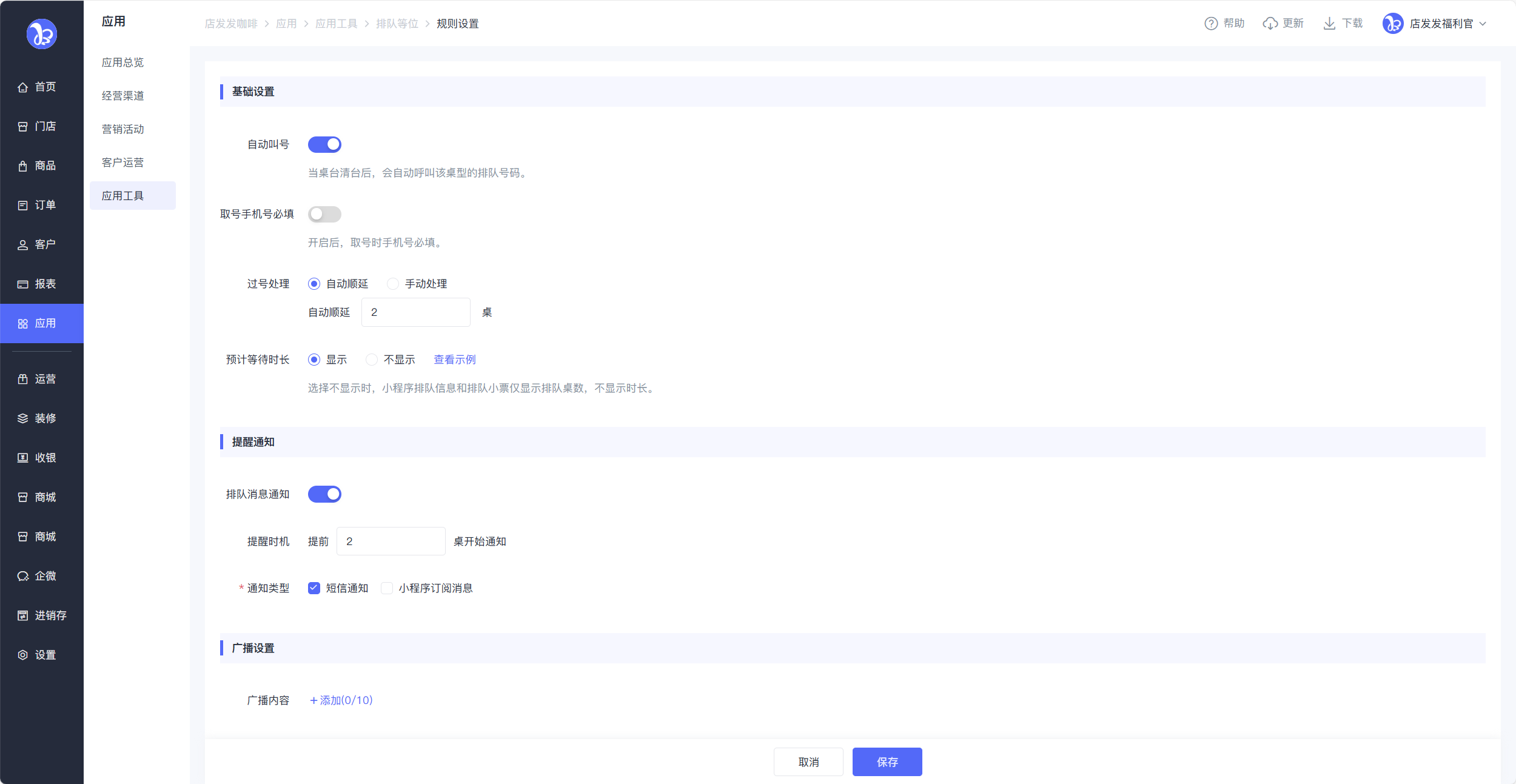设置是否自动叫号、是否填写手机号、过号处理、排队消息通知、广播内容、是否开启排队营销等选项。