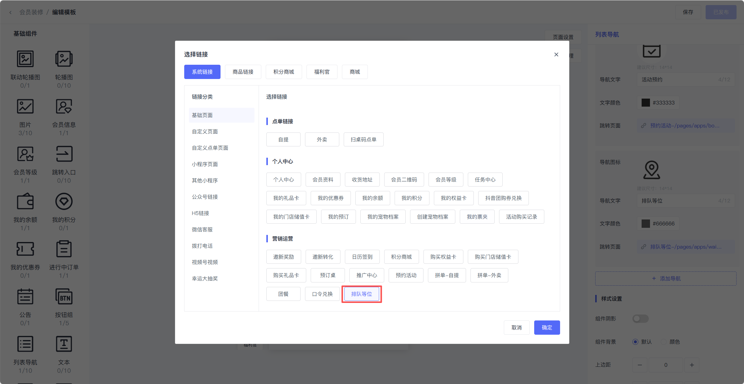 商家在小程序装修中链接排队等位,顾客可直接进入小程序取号,并可查看排队进度。