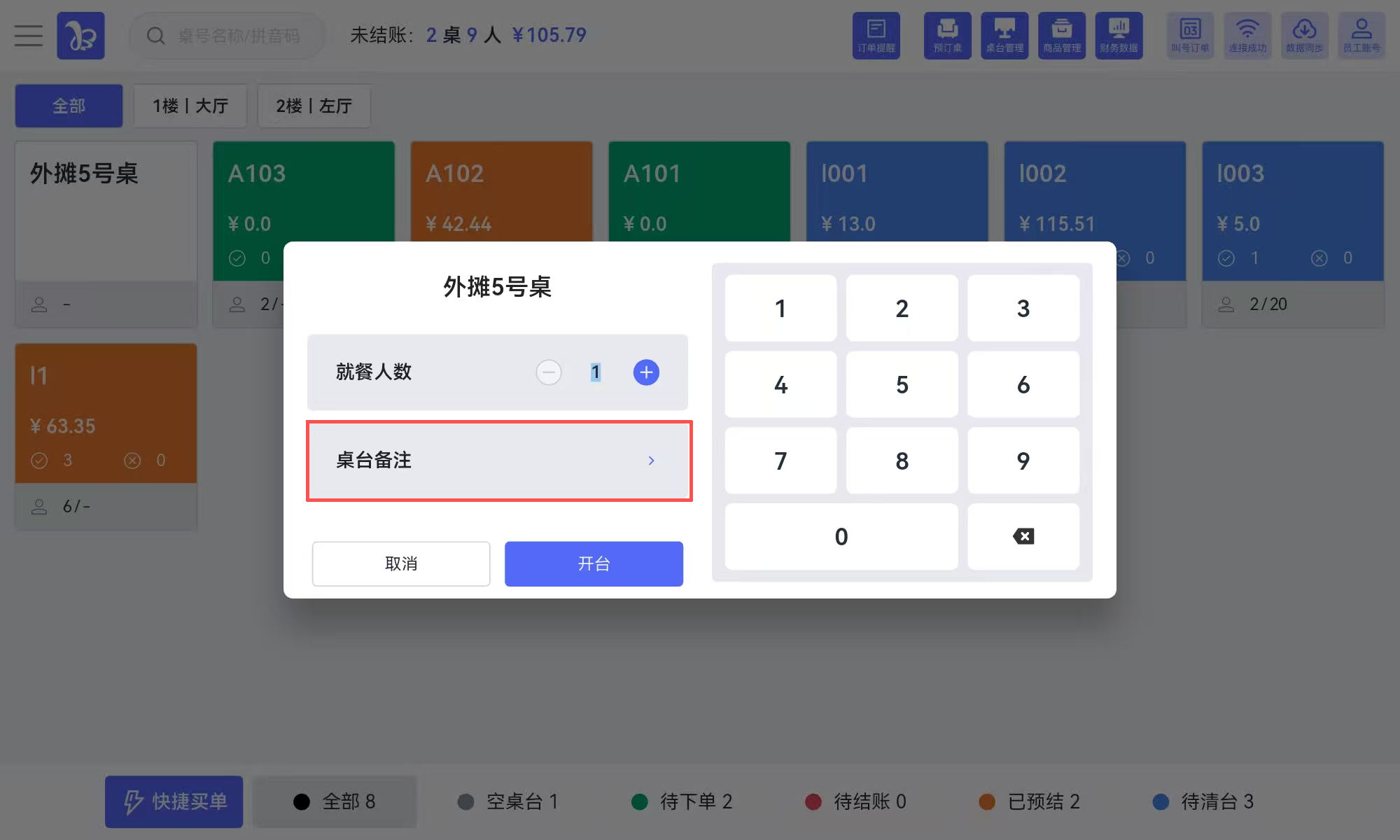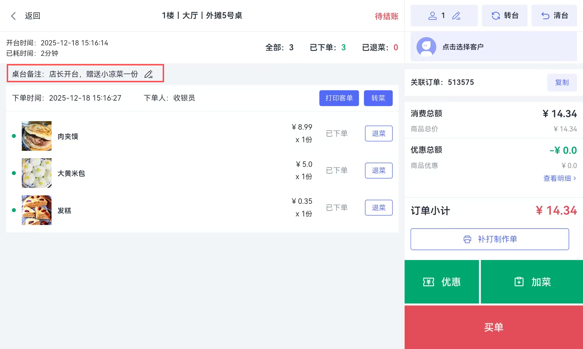 先吃后付场景下,开台时可输入桌台备注,并在桌台详情页显示备注信息,通过记录和传递特殊需求,保障服务效率并提升客户满意度。