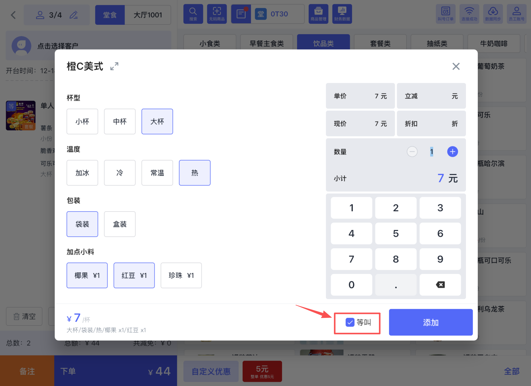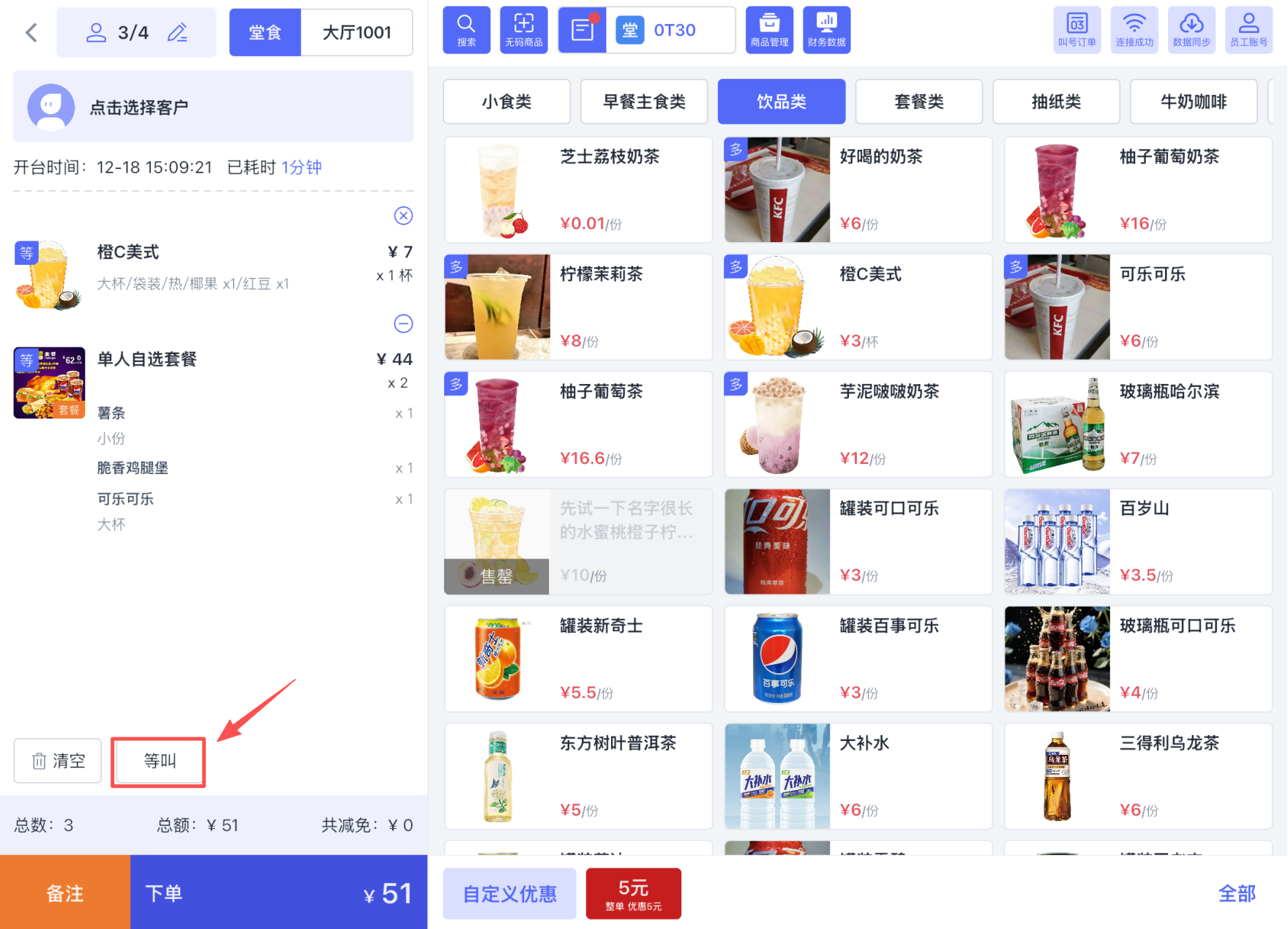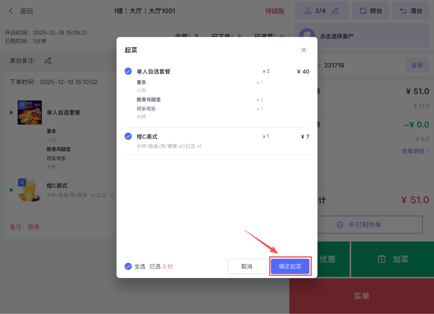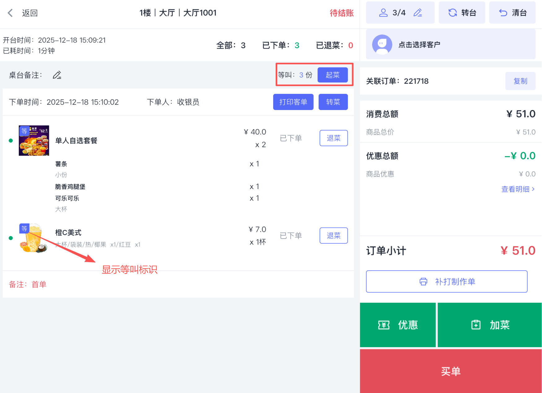 先吃后付模式下,点单时可将菜品设置为“等叫”状态,后厨根据订单准备,顾客要求上菜时再进行“起菜”,并打印起菜小票,常用于顾客未全部到齐或其他特殊上菜需求的场景。