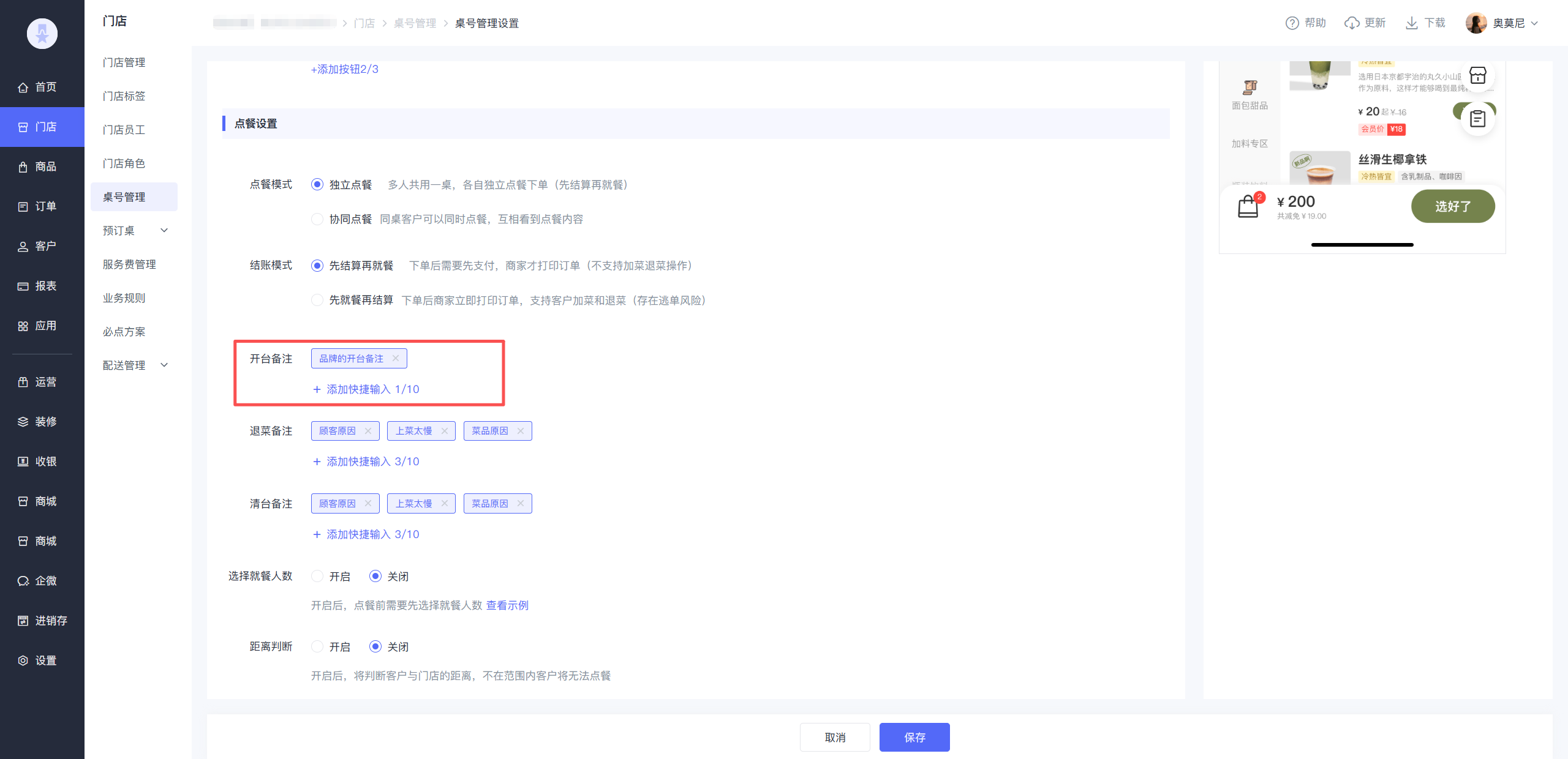 设置快捷桌台备注路径:品牌后台-门店-桌号管理-点餐设置