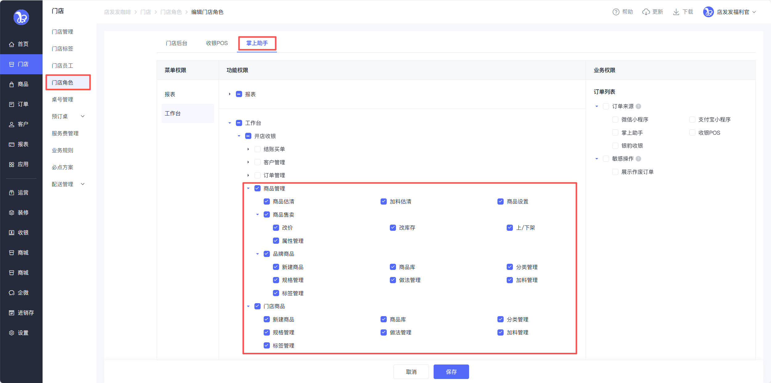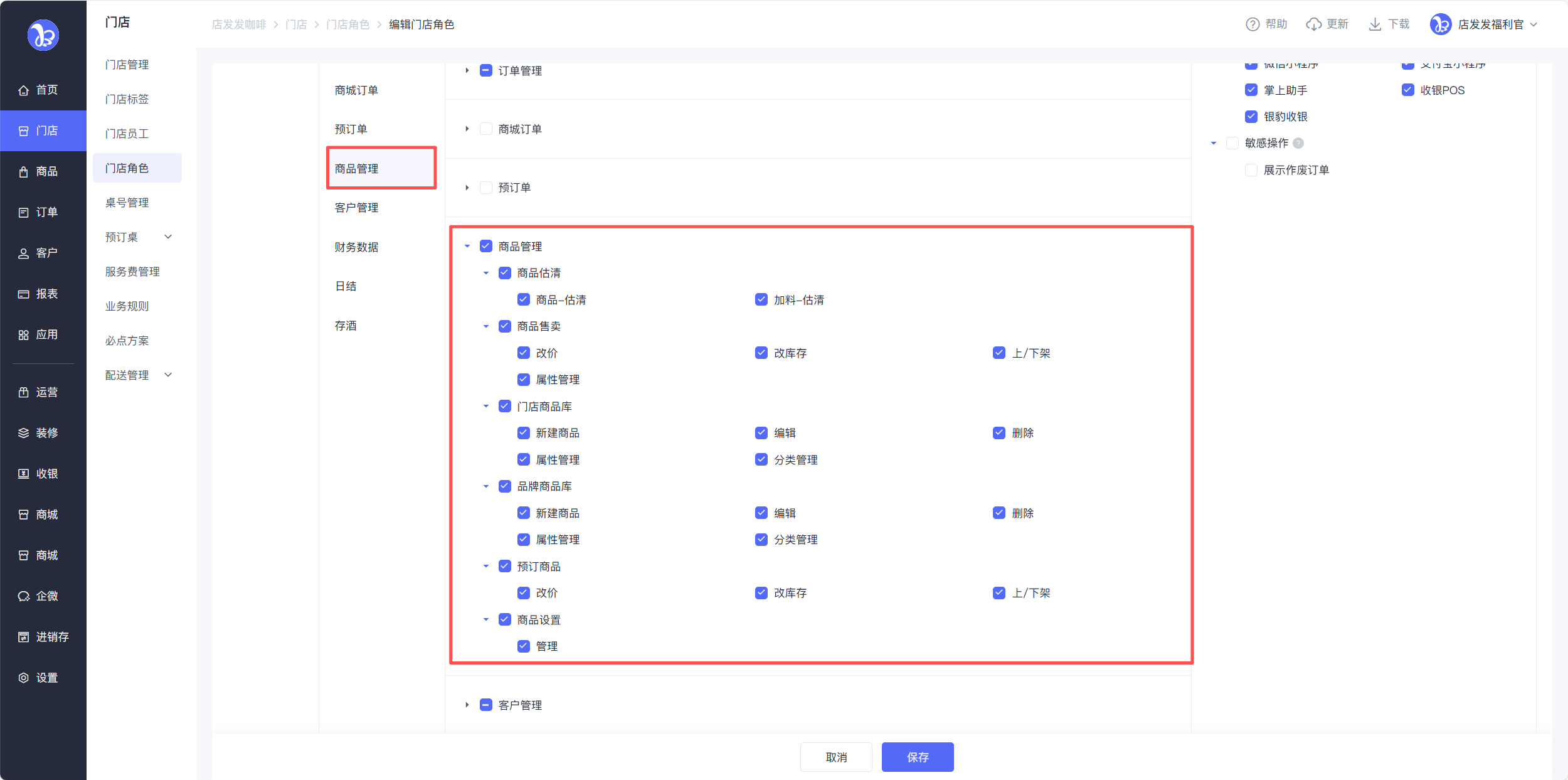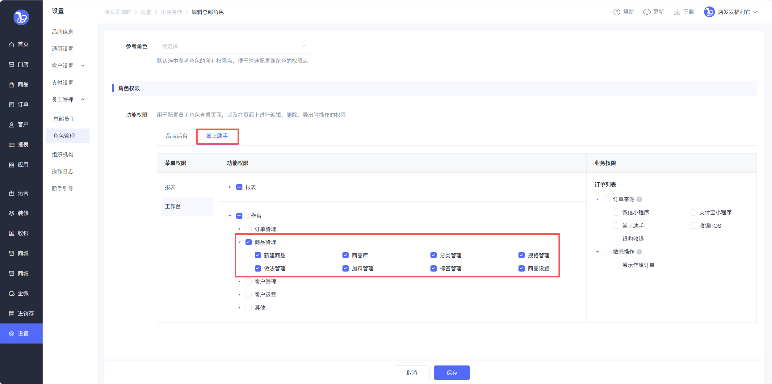 【门店角色】新增【POS端】和【助手端】的商品管理权限,POS端可配置商品估清、商品售卖、门店商品库、品牌商品库、预订商品、商品设置权限;助手端可配置商品管理和门店商品的权限。