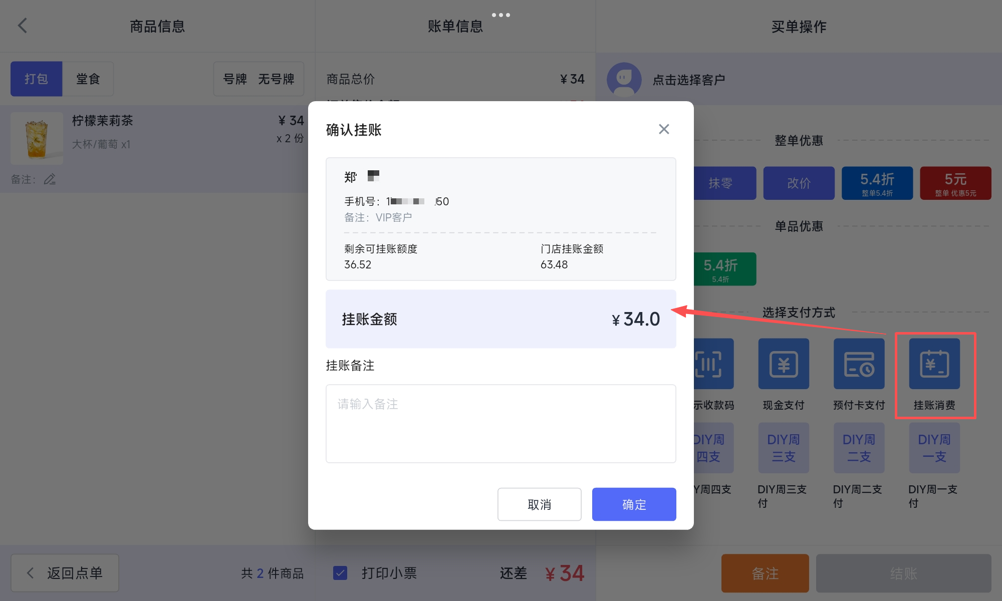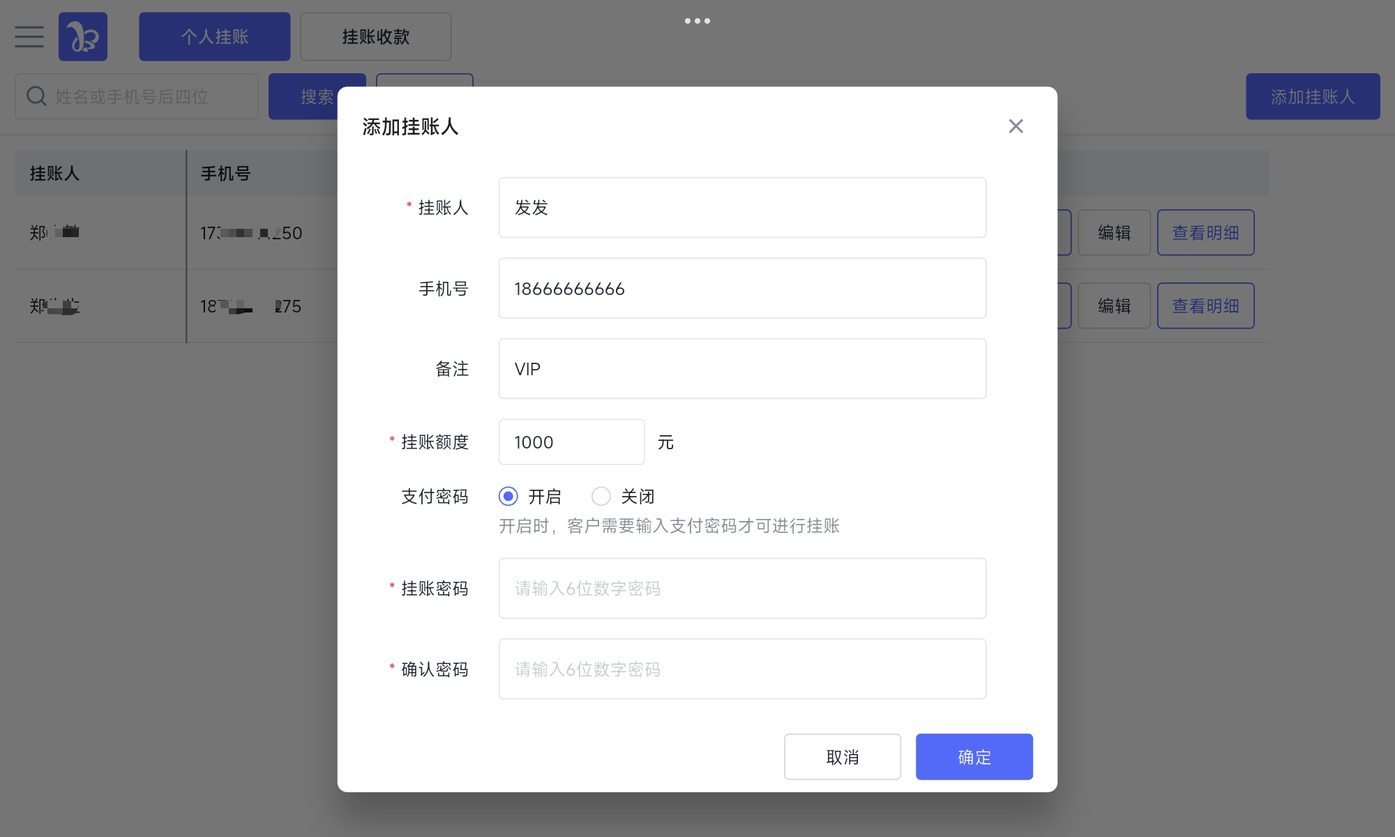 输入挂账人姓名、手机号、挂账额度等信息,可设置挂账密码,保证资金安全。