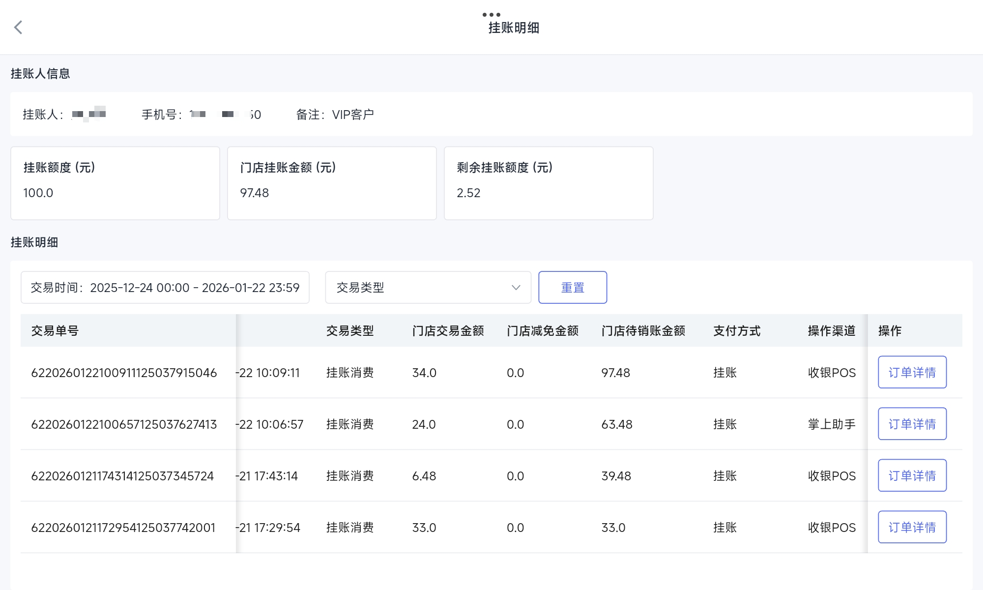 可查看挂账人的挂账额度、挂账金额、剩余额度、以及关联的订单等内容。