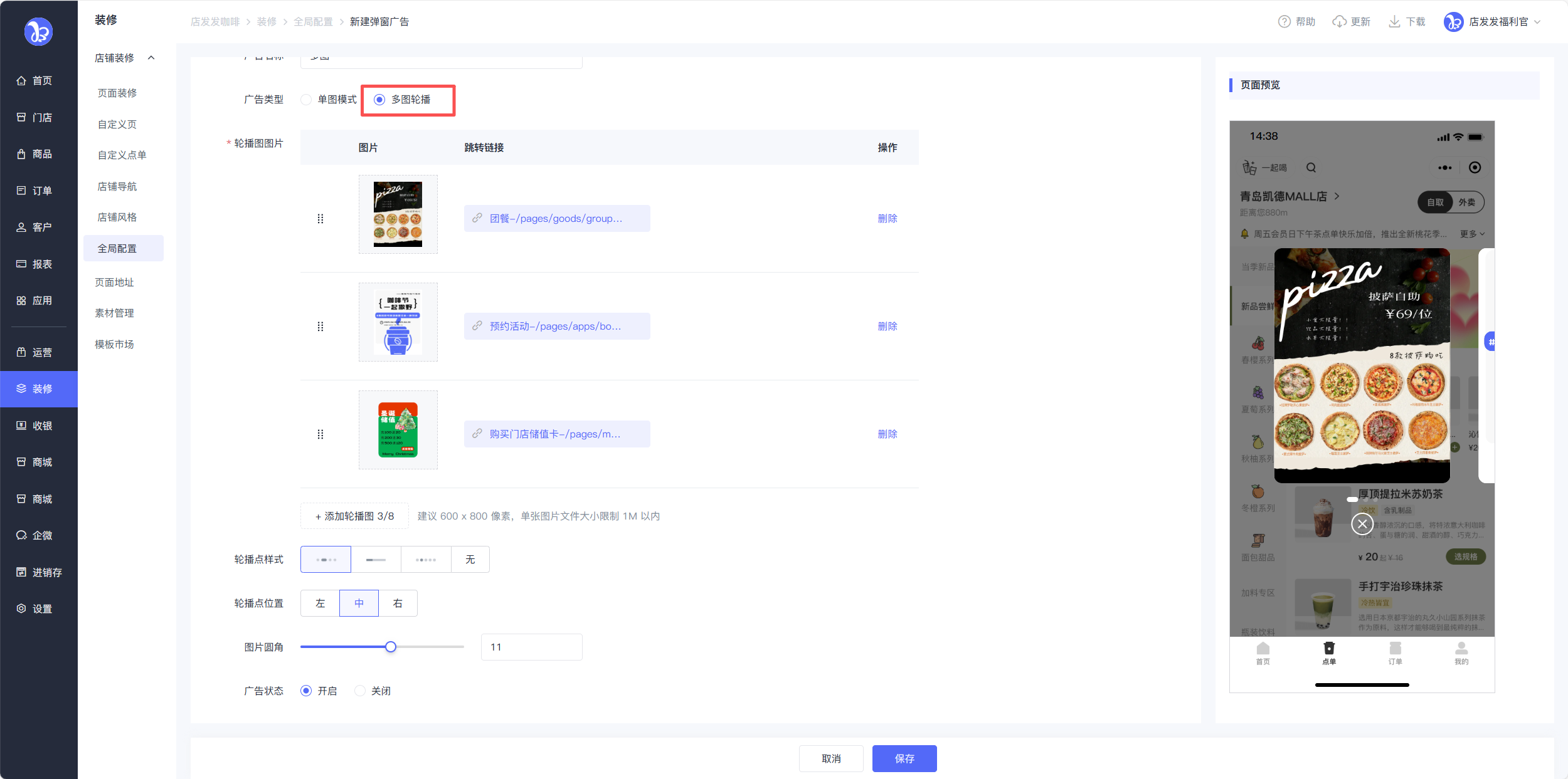 弹窗广告增加多图轮播模式,可设置轮播点的样式和位置,并调整图片的圆角。