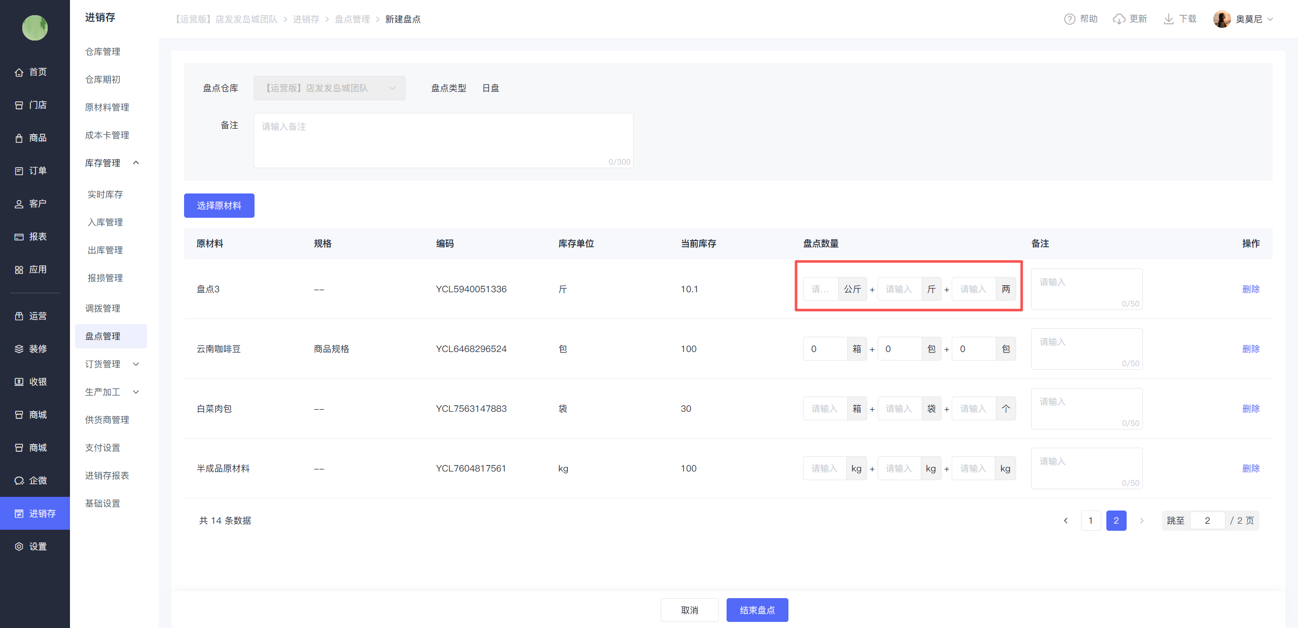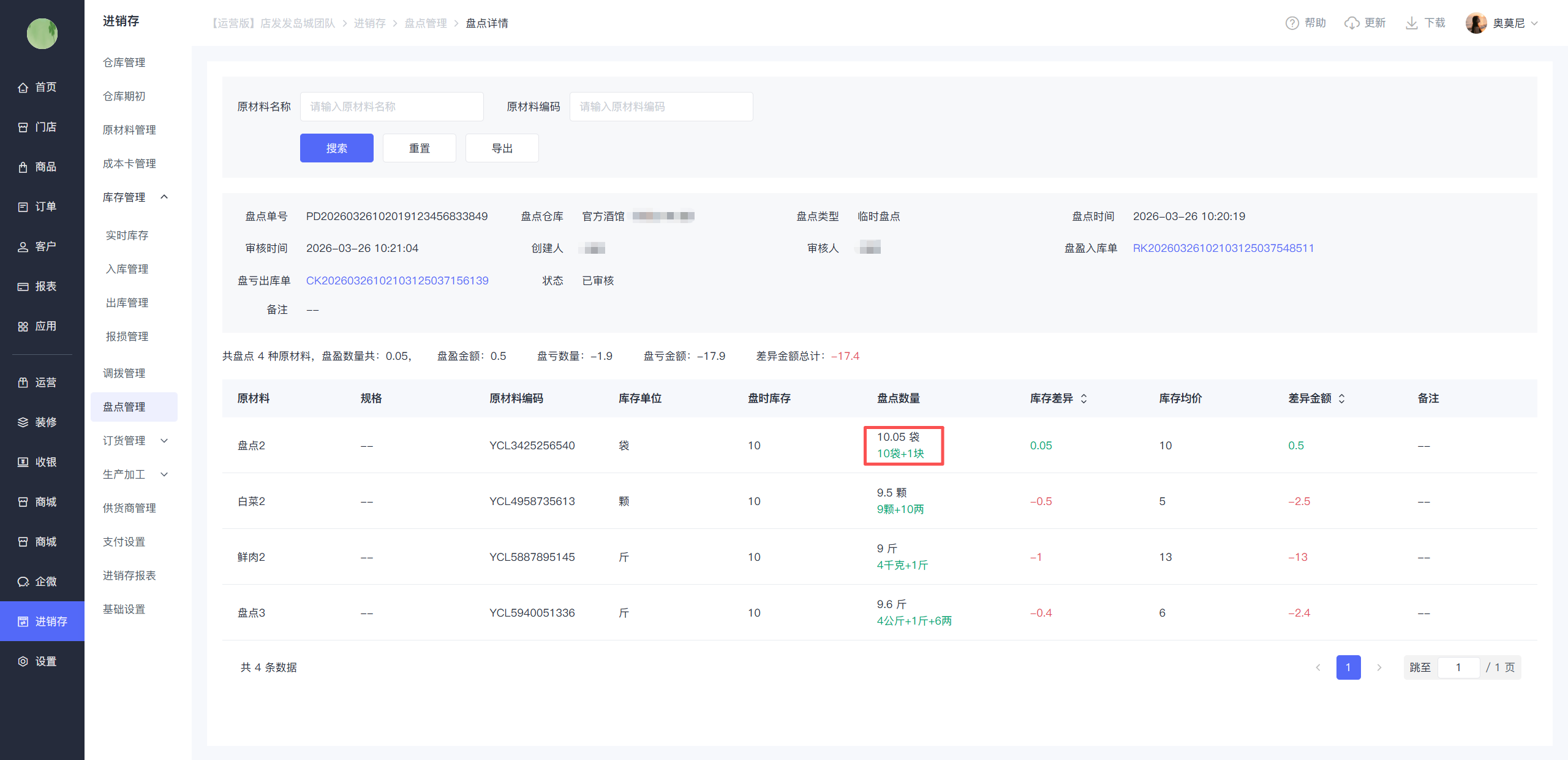 库存单位、成本单位、订货单位设置的单位不一致时,盘点时所有单位均显示,商家无需再次换算。