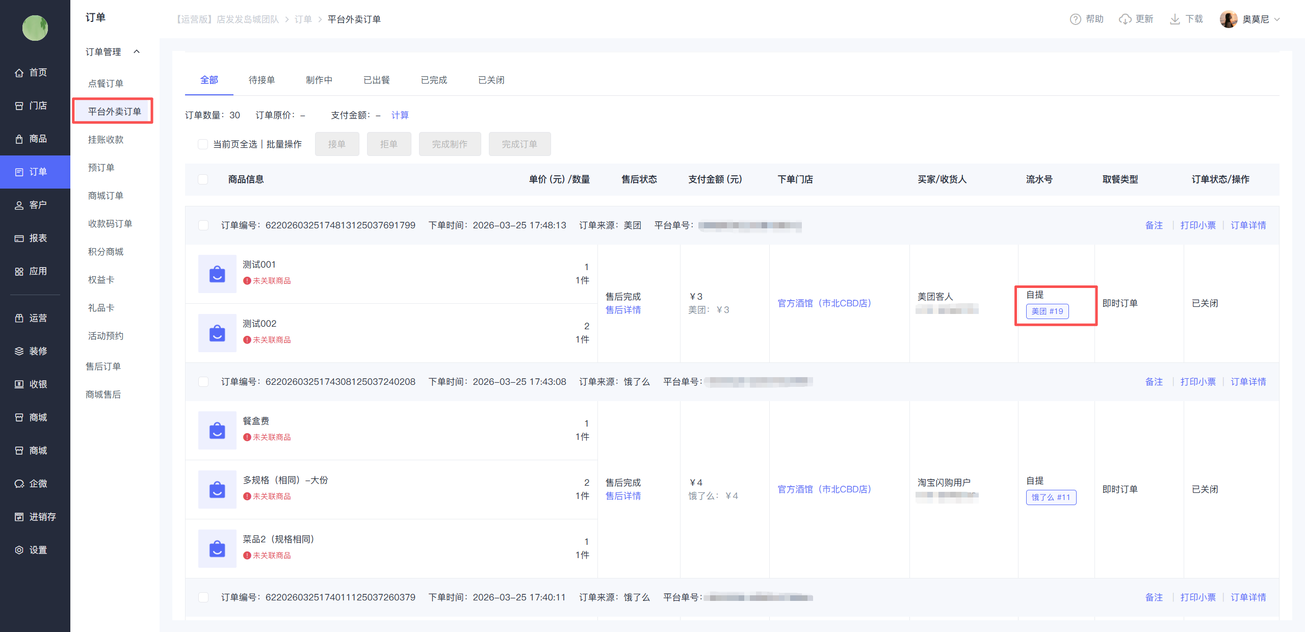 可同步接单并管理美团/饿了么/京东等第三方平台的外卖自提订单,并给客户打印外卖自提小票。