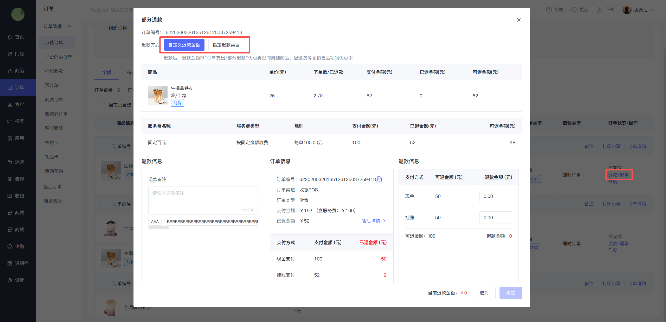 订单支持部分退款,可自定义退款金额或选择退款商品、服务费或配送费指定类目进行退款。