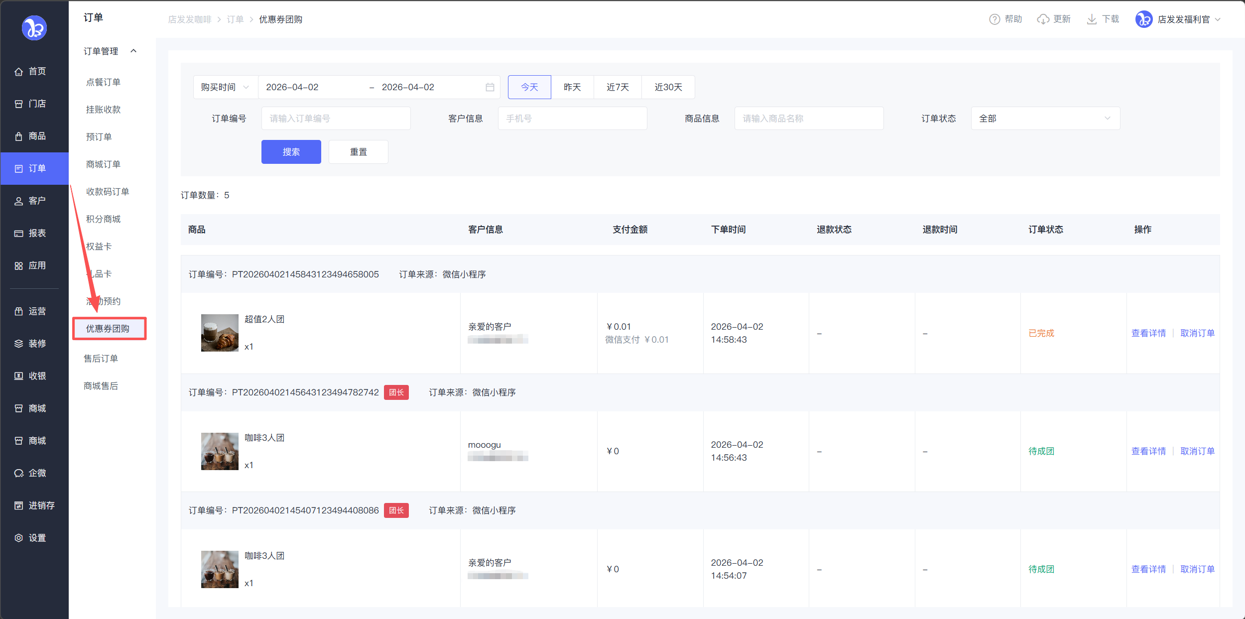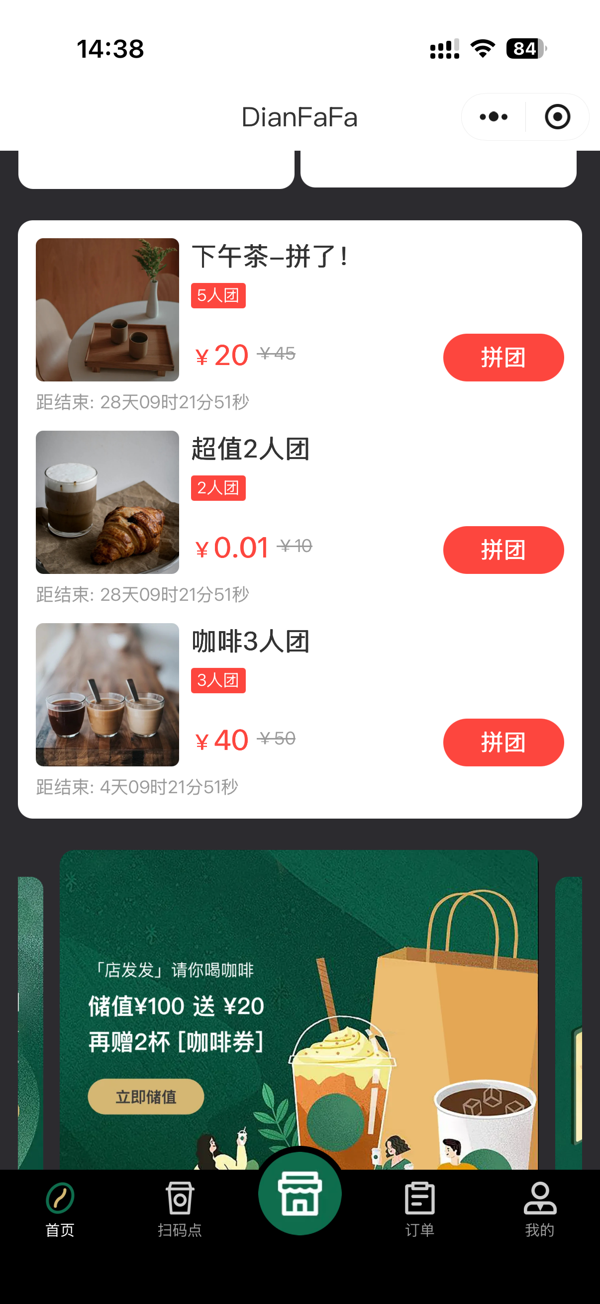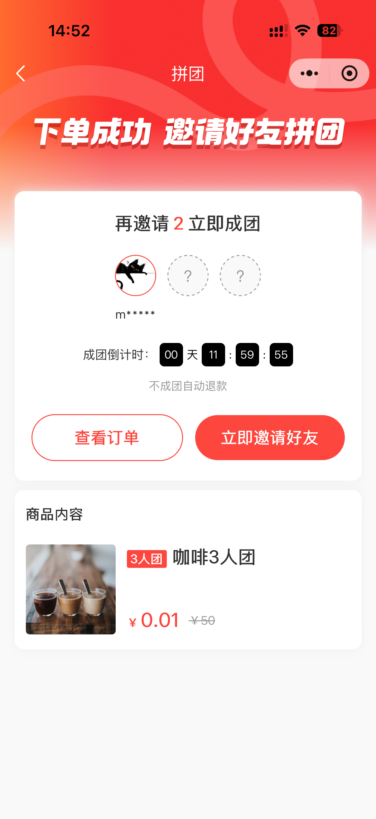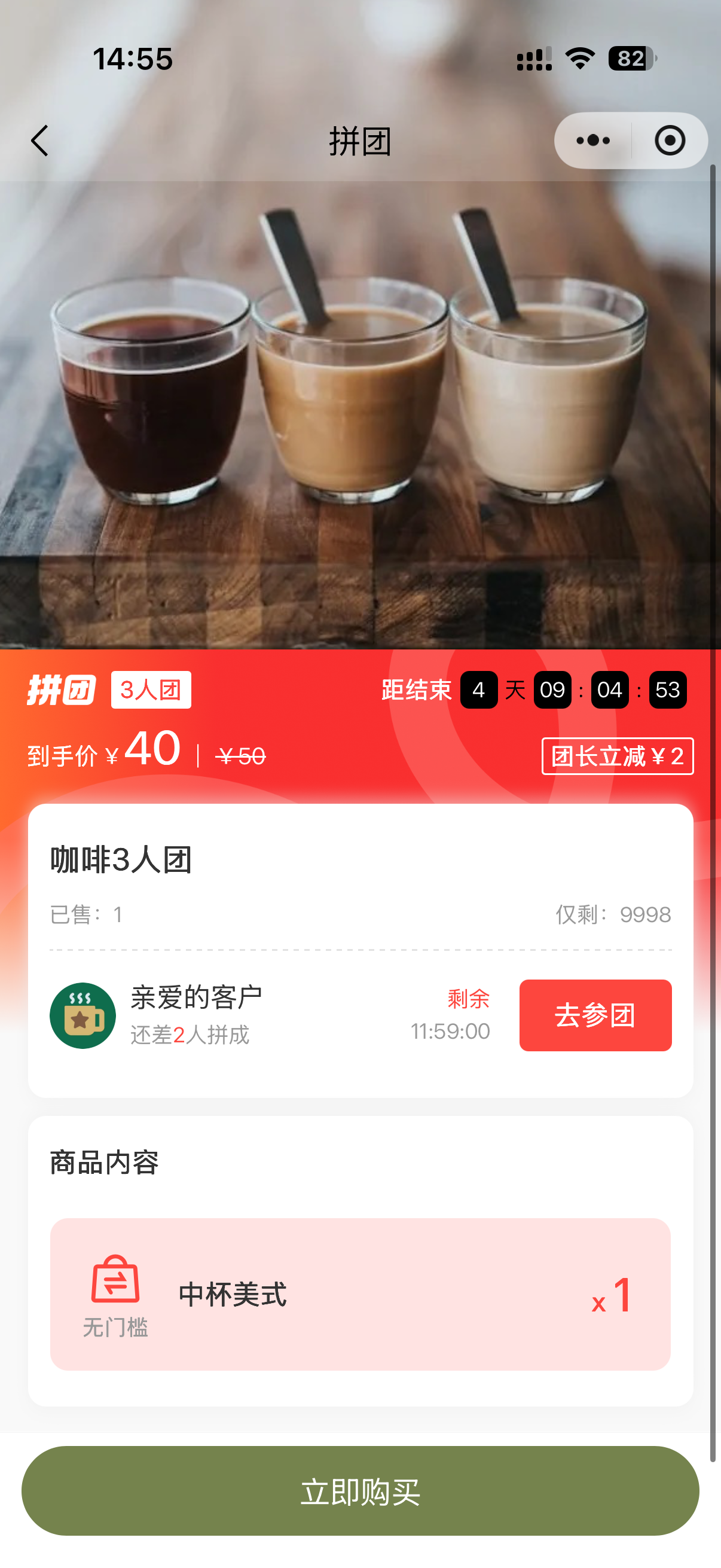 玩法参考:24小时内,3人成功拼团,可5元购买咖啡兑换券,团长额外优惠2元。