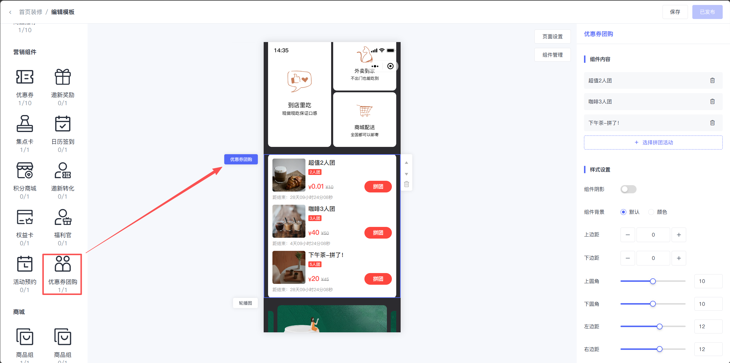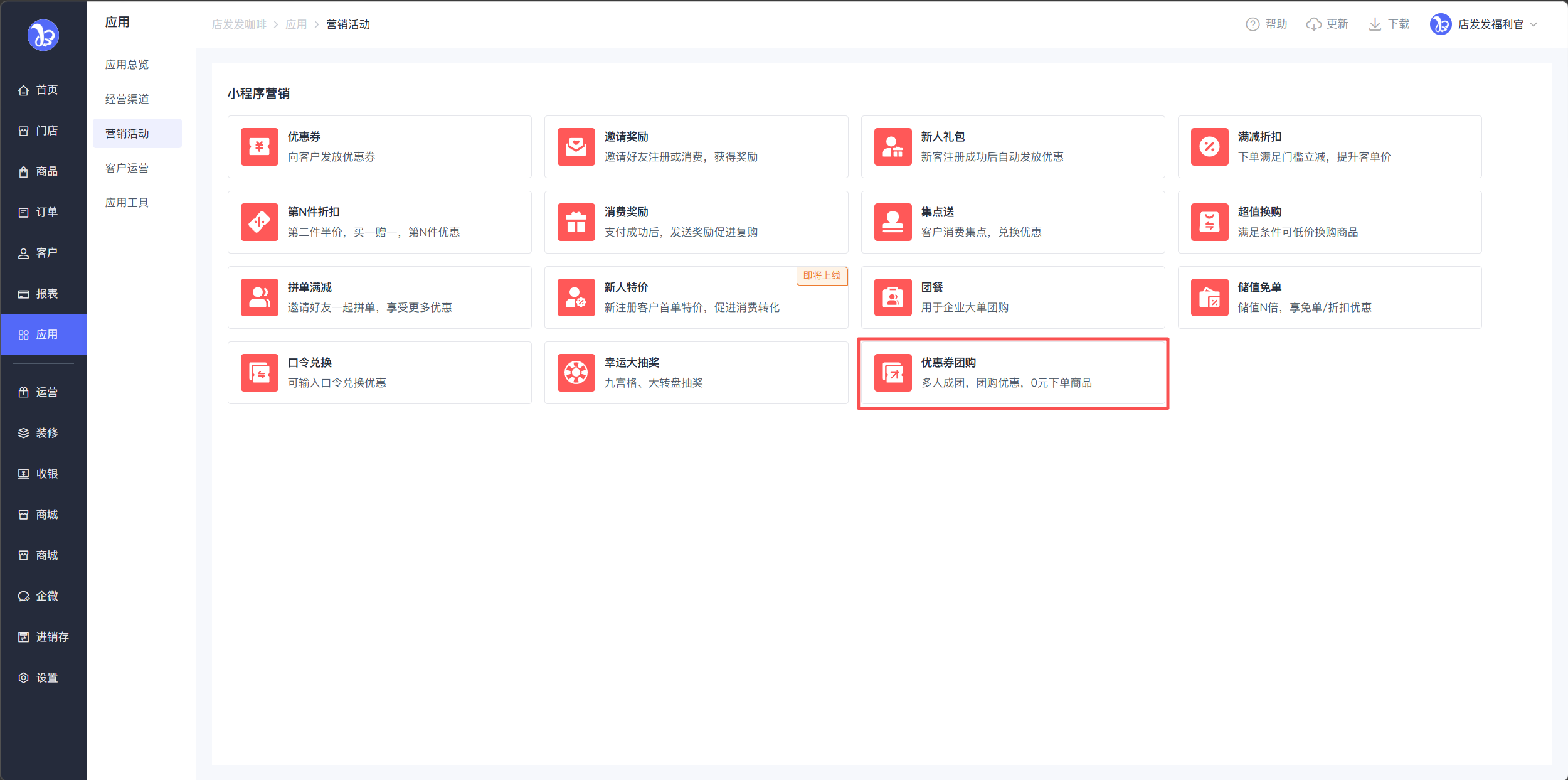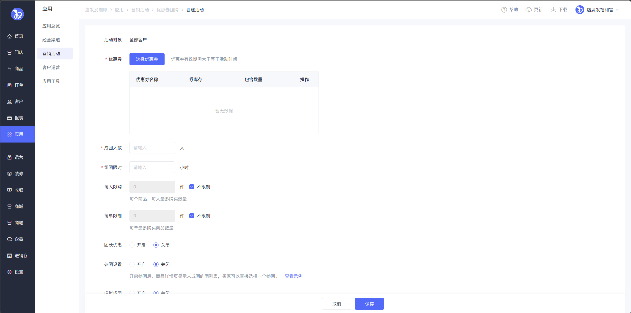 路径:品牌后台-应用-营销活动-优惠券团购