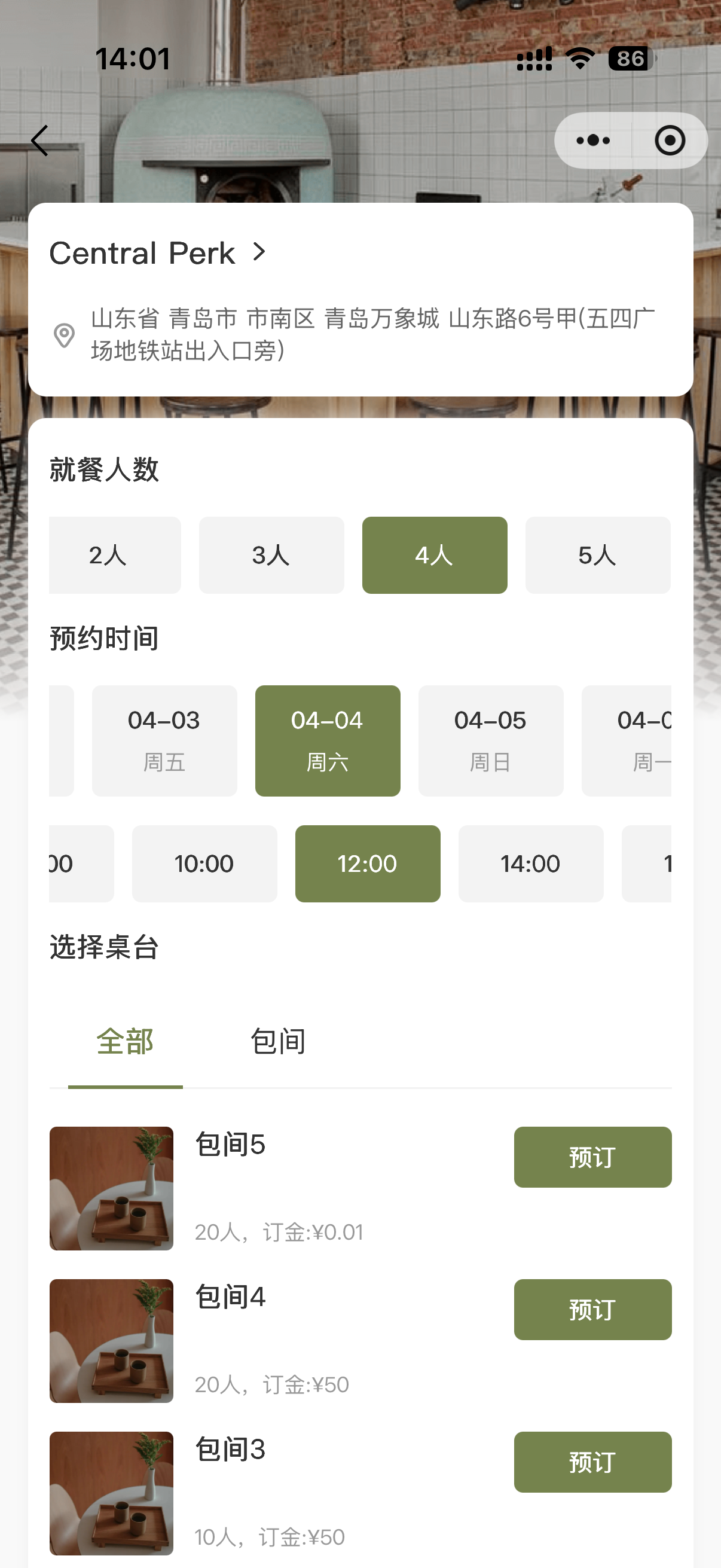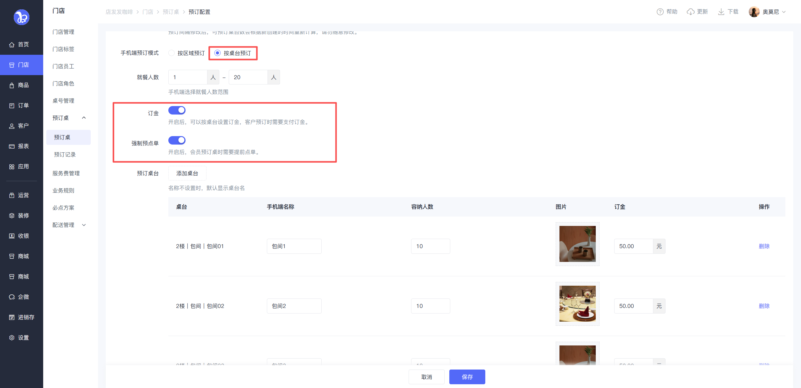 按桌台模式预订时,支持设置订金,同时可开启强制预点单,顾客需要先通过小程序点单后才能预定。