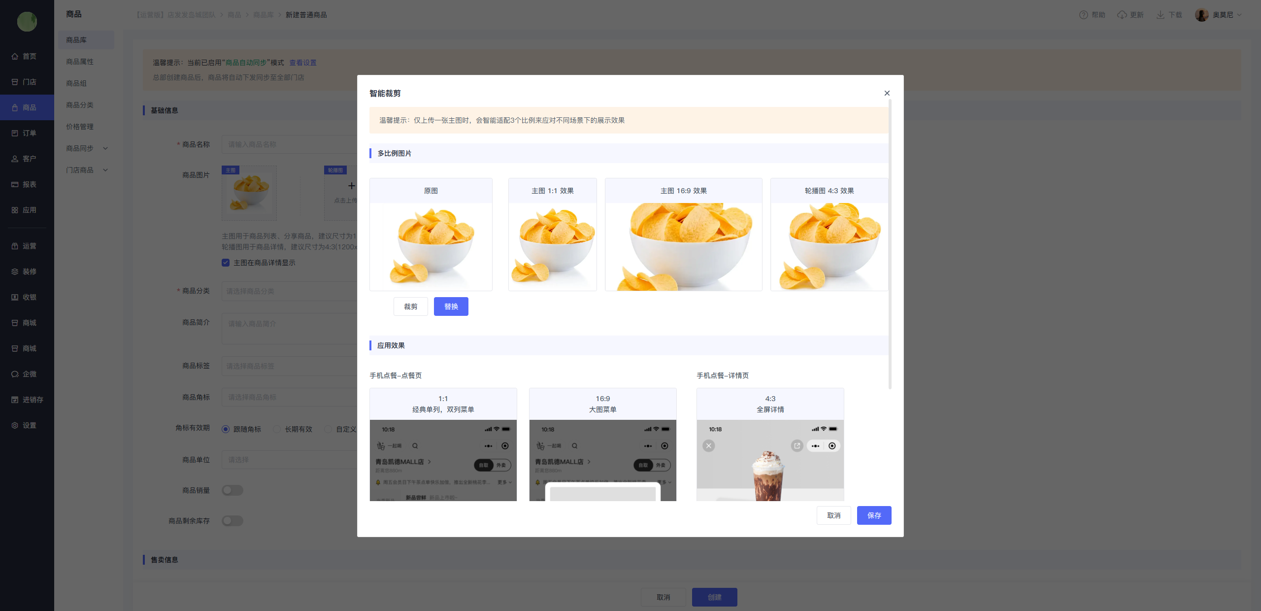 商品主图可裁剪为1:1或16:9比例,轮播图(用于商品详情页)为4:3比例,仅上传一张主图时,会智能适配3个比例来应对不同场景下的展示效果。