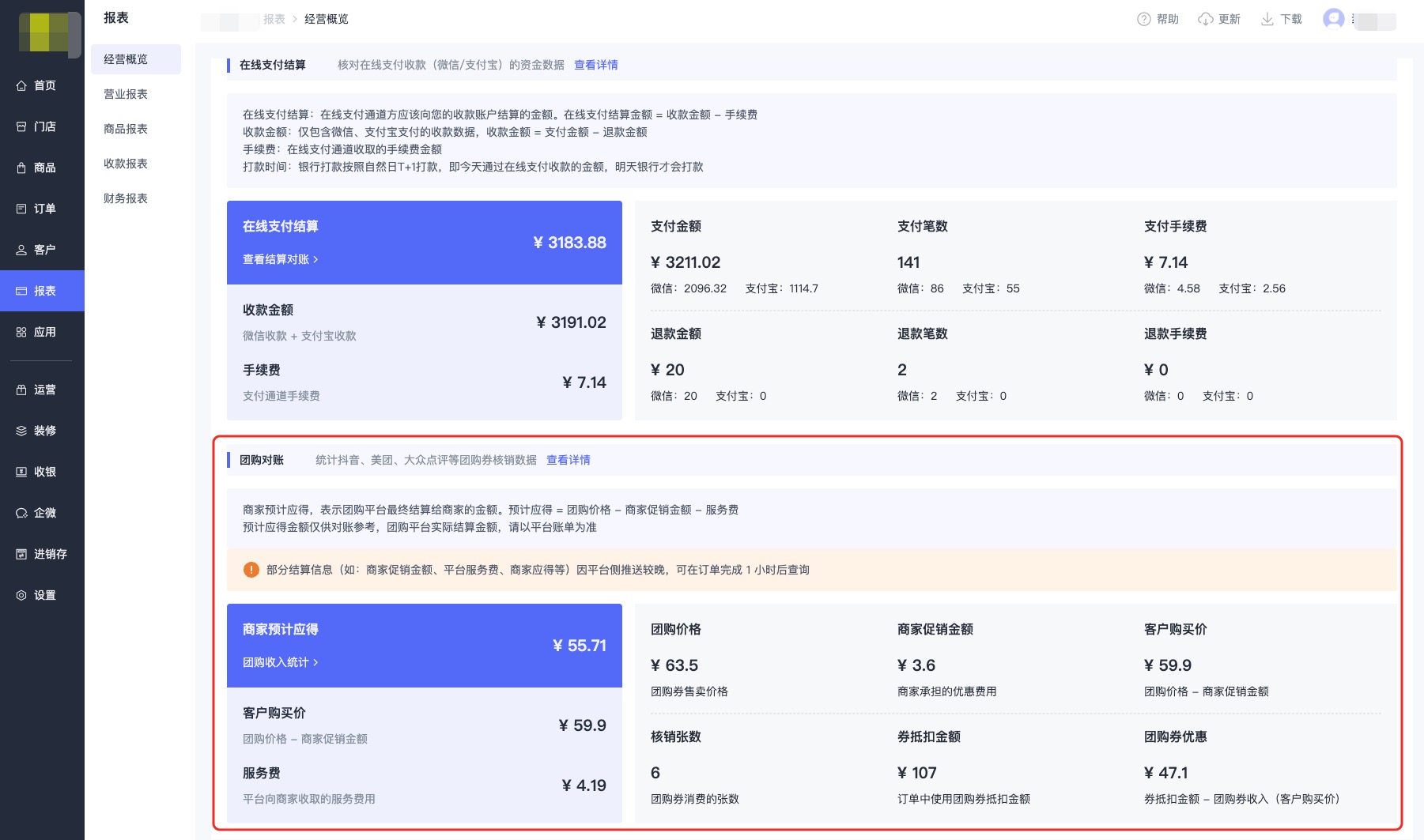 团购收入:包含抖音、美团/点评等三方团购券收入金额(收入金额 = 客户购买团购券金额)