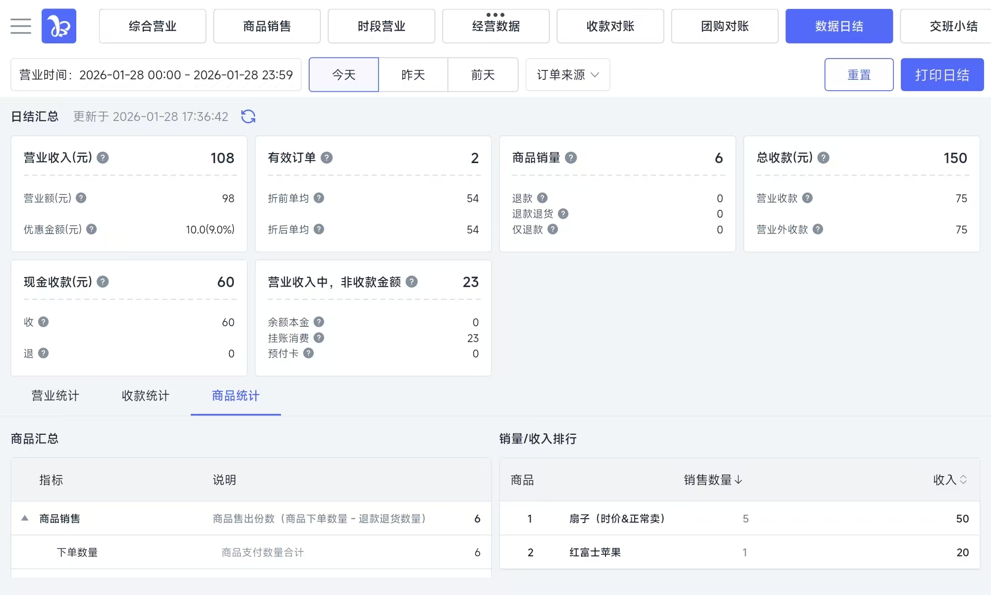 系统按营业日自动汇总核心经营数据,包括营业收入、有效订单数、商品销量、总收款、现金收款、营业收入中,非收款金额,通过多维数据帮助商家看懂每日经营数据、优化管理,同时日结小票也同步更新。